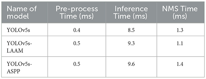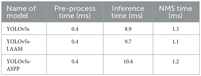 The inference speed of the two models on the internal and external test sets is presented in Tables 9, 10. Grad-CAM was also used to visualize the heat maps of the YOLOv5-ASPP and YOLOv5-LAAM models, and the results are shown in Figure 11.