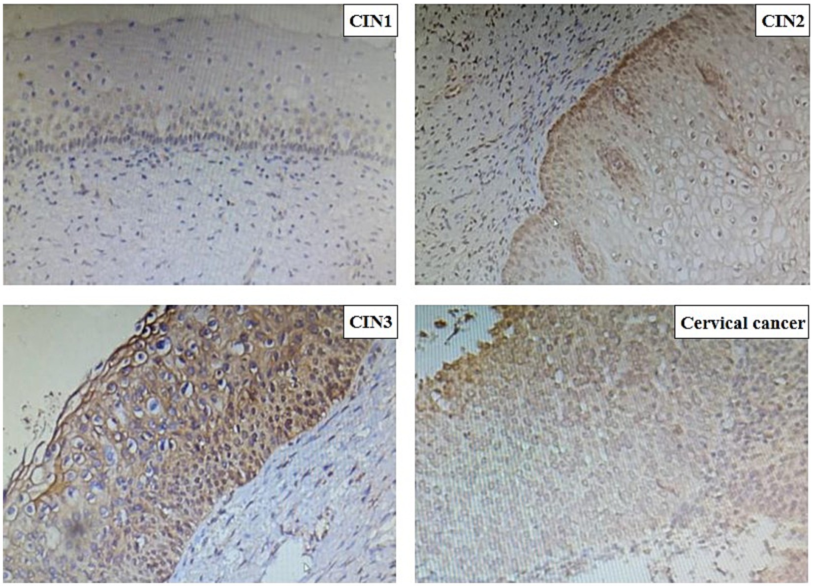 The two proteins were expressed in cervical tissue, and the positive rate of CIN3 was high. Compared with other groups, the difference was significant. The positive rates of each group are given in Tables 1, 2.