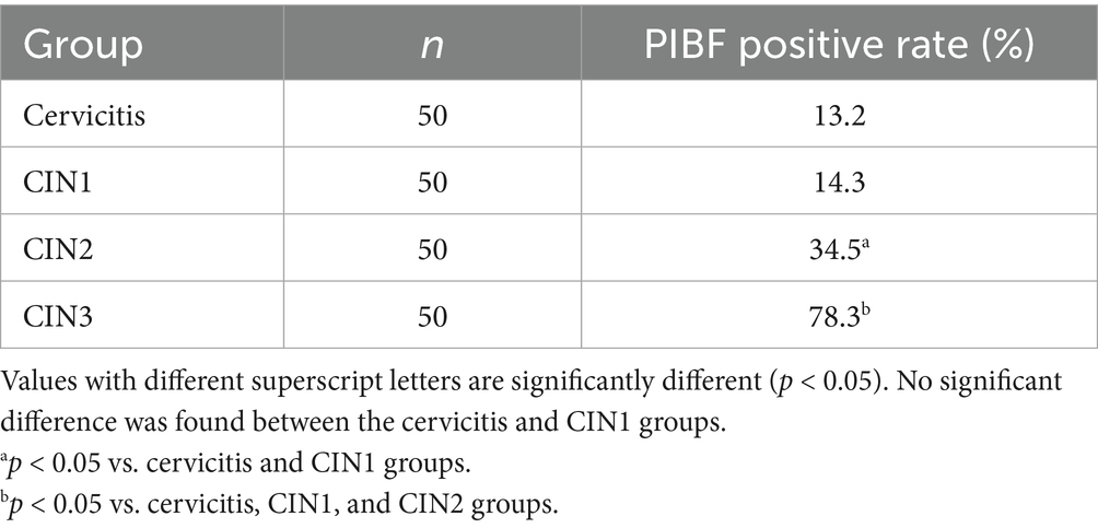 Progesterone regulates PIBF and Galectin-1, both of which play an immunomodulatory role in the maternal-fetal interface. Galectin-1 deficient mice have a significantly increased rate of embryo loss (9, 10). The PIBF index is significantly lower in patients with preeclampsia and those with pregnancy failure (11, 12). In addition, PIBF and Galectin-1 levels were also decreased in pregnant patients treated with mifepristone (13). Other studies have confirmed that elevated PIBF levels inhibit immune responses and promote tumor progression in tissue specimens of breast cancer, bowel cancer, and liver cancer (14, 15). In ovarian cancer patients, PIBF levels are also elevated, promoting tumor invasion (16, 17). However, the progression from cervical intraepithelial neoplasia to invasive cancer is a multi-step and multifactorial process that is not fully understood. Its progression is jointly influenced by various factors such as persistent HPV infection, host immune response, genetic and epigenetic alterations, and changes in the tumor microenvironment (18). Given the crucial roles of PIBF and Galectin-1 in mediating immune tolerance and promoting tissue remodeling at the maternal-fetal interface, we speculate that they may play similar roles in the immune microenvironment of cervical precancerous lesions, potentially promoting disease progression.