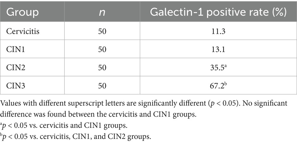 Results: PIBF and Galectin-1 levels in cervicitis and CIN1 tissues showed no statistically significant difference; the levels of PIBF and Galectin-1 in CIN2 and CIN3 tissues were higher than those in cervicitis and CIN1, and the differences were statistically significant when compared with other groups in the CIN3 group.