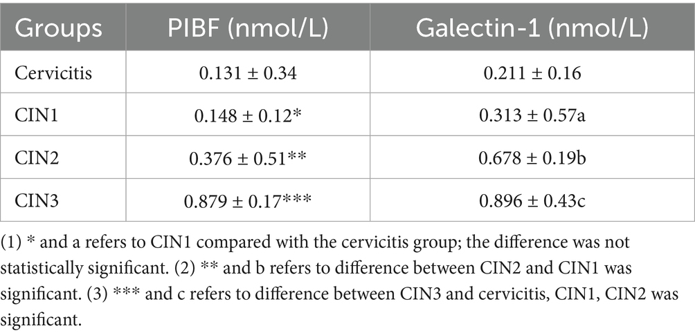 Both molecules were detected in each specimen, and their levels increased concomitantly with the severity of the cervical lesions. No statistically significant difference was observed between cervicitis and CIN1, but significant differences exist between cervicitis and CIN1 and high-grade cervical lesions. The Galectin-1 level was higher than PIBF within the same group, and the level of Galectin-1 increased gradually with the severity of lesions. Notably, no significant difference was observed between the cervicitis group and CIN1, but there were obvious differences between the cervicitis group, the CIN1 group, and the other two groups, which is exhibited in Table 3.