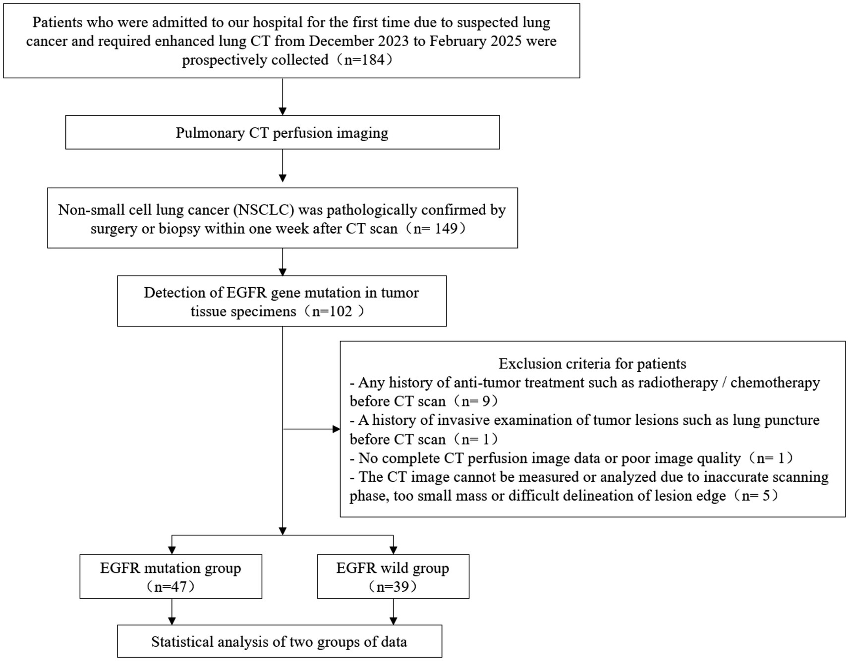 Patients who required enhanced CT due to suspected lung cancer in our hospital were prospectively recruited from December 2023 to February 2025. The inclusion criteria were as follows: (1) patients received CTPI examination in our hospital; (2) pathological NSCLC diagnosis confirmed by surgery or biopsy; (3) EGFR gene mutation detection was performed on tumor tissues; and (4) an interval not exceeding 1 week between CTPI examination and tumor tissue biopsy. Patients were excluded if (1) they had history of any anti-tumor treatment, such as radiotherapy or chemotherapy, before CTPI examination; (2) they had history of traumatic examination of tumor lesions such as puncture before CTPI examination; (3) the image data of CTPI was incomplete or had poor quality; (4) the image data of CTPI could not be measured and analyzed due to inaccurate scanning phase, too small mass, or blurred tumor outline. The flow diagram of patient enrollment is shown in Figure 1.