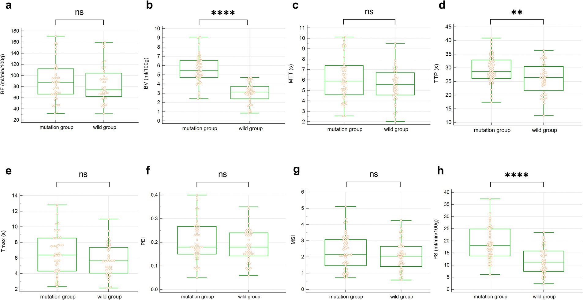 Figure 4. The box plot of univariate analysis between the two groups of CTPI parameters. (a–h) BF, BV, MTT, TTP, Tmax, PEI, MSI and PS. ns represents p > 0.05, ** represents p < 0.01, **** represents p < 0.0001.