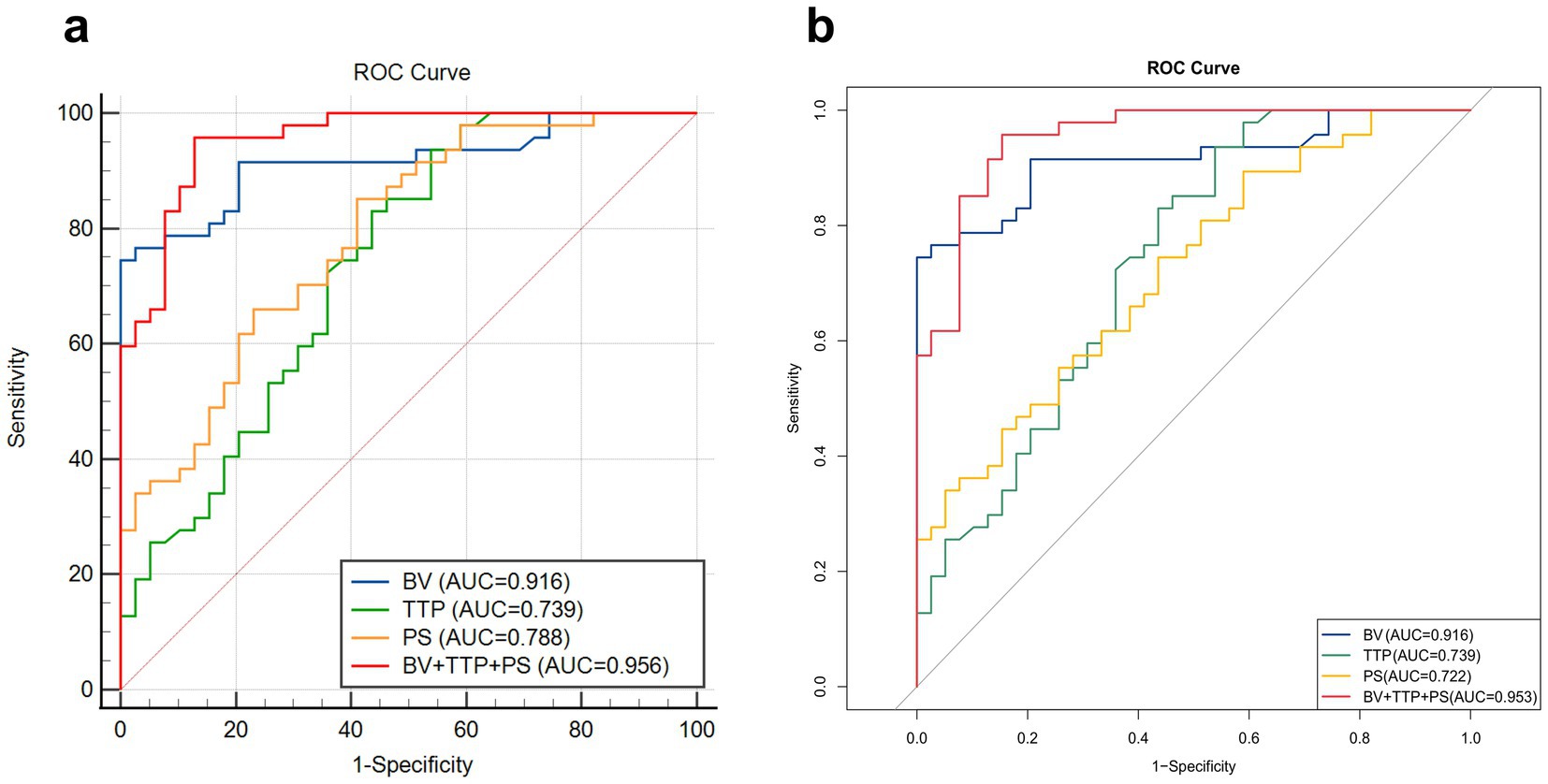 ROC curves were constructed for the independent predictors screened out. According to ROC, the AUC of BV was 0.916, and its sensitivity, specificity, and accuracy were 74.47, 100, and 82.56%, respectively, with a cut-off value of 4.69. The AUC of TTP was 0.739, and its sensitivity, specificity, and accuracy were 93.62, 46.15 and 67.44%, respectively, with a cut-off value of 23.84. The AUC of PS was 0.788, and its sensitivity, specificity, and accuracy were 85.11, 58.97, and 68.60%, respectively, with a cut-off value of 12.11. The AUC of the combined predictive model (BV + TTP + PS) for EGFR mutation reached 0.956, and its sensitivity, specificity, and accuracy were 95.74, 87.18, and 89.53%, respectively. The predictive performance of the combined model was superior to that of any single parameter (p < 0.05). See Table 6 and Figure 5a for details.
