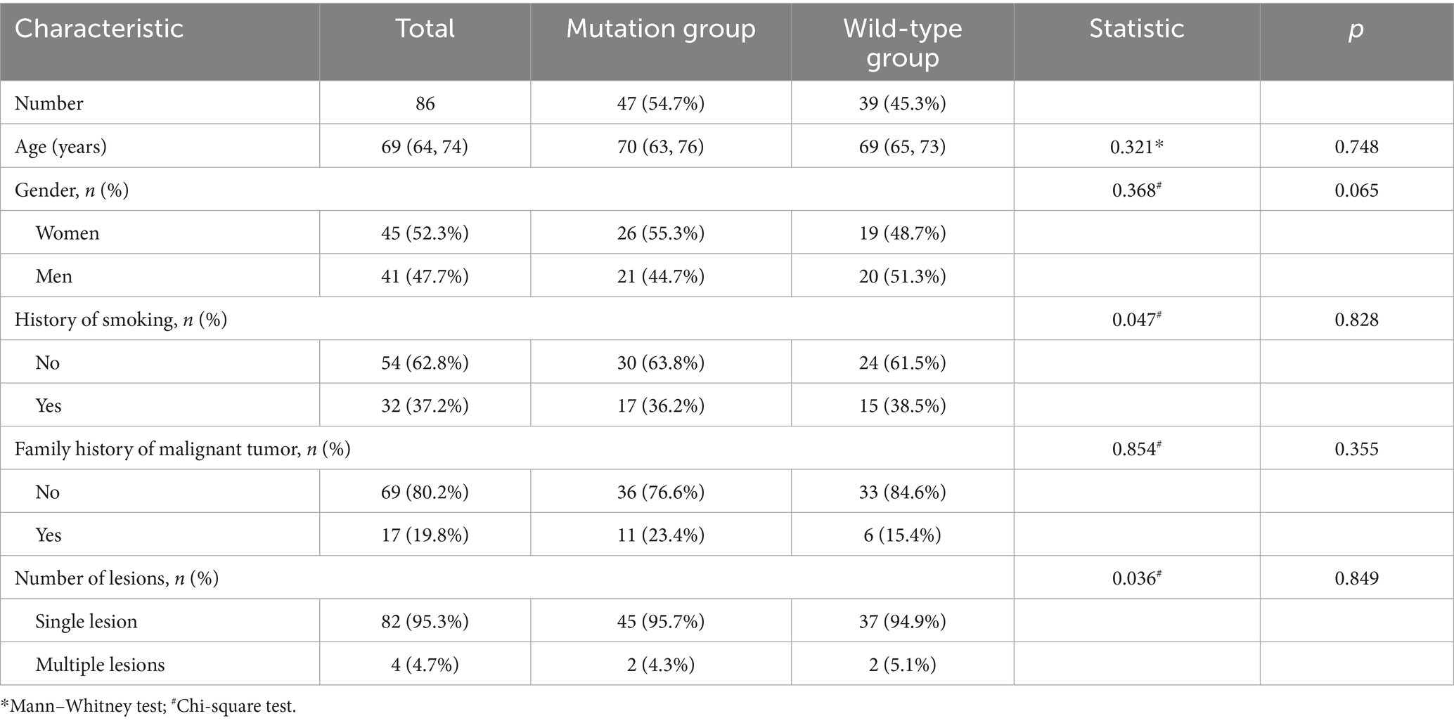 A total of 86 patients were finally recruited, including 45 women and 41 men, with an average age of 69 years (ranging from 41 to 90 years). There were 82 (95.3%) adenocarcinoma cases and 4 (4.7%) squamous cell carcinoma cases. In terms of personal history, 32 (37.2%) had a history of smoking and 17 (19.8%) had a family history of malignant tumors. In addition, 82 (95.3%) presented with a solitary lung lesion.