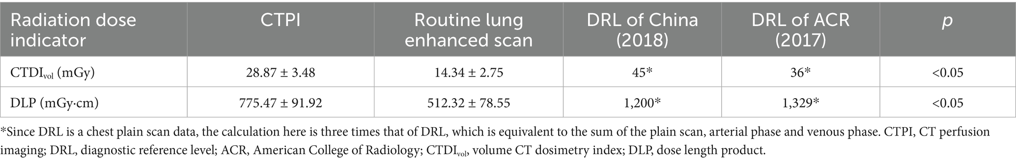 Based on the characteristics of the patients finally included in this study, 86 patients (45 women and 41 men) who underwent a routine lung CT enhanced scan were randomly selected at last. The comparison of the radiation dose of CTPI with that of conventional enhanced lung scan and the DRL of China and ACR is shown in Table 2. The results showed that, although the CTDIvol and DLP of CTPI were higher than those of routine lung-enhanced scans, they were still far lower than the DRL of China and ACR.