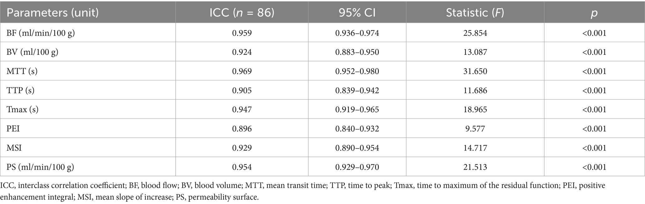 The inter-observer consistency is robust, with ICC values greater than 0.85 for all CTPI parameters (Table 3), indicating that the two radiologists’ manual ROI delineation for CTPI parameter measurement is reliable and reproducible.