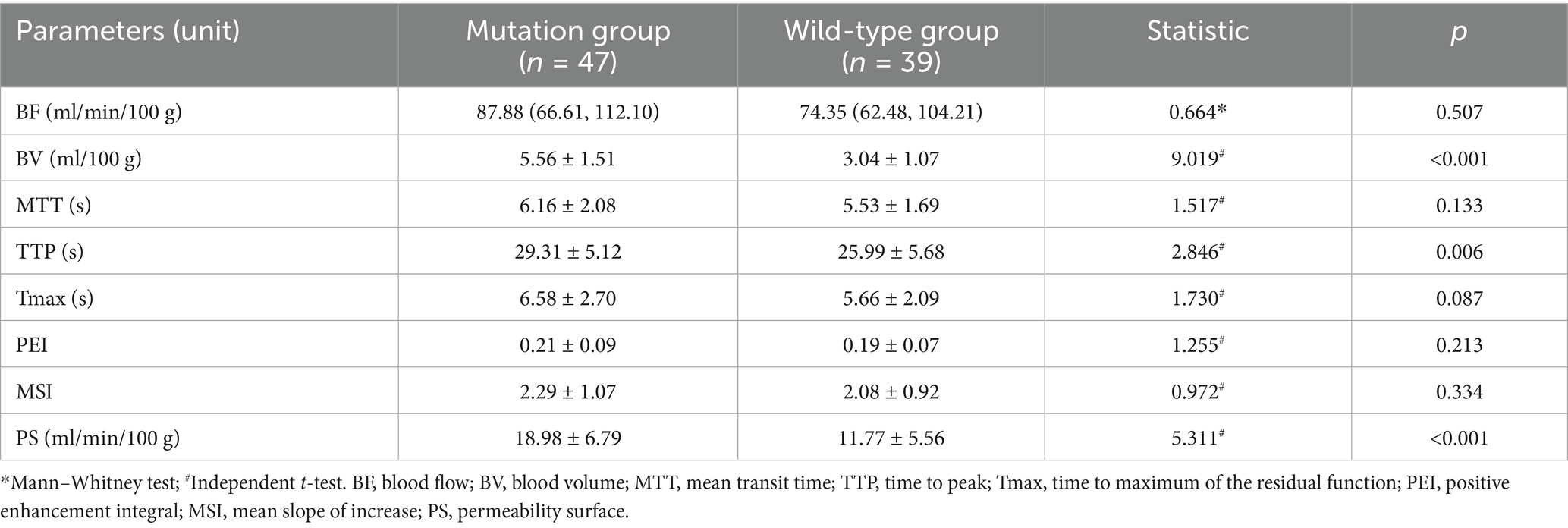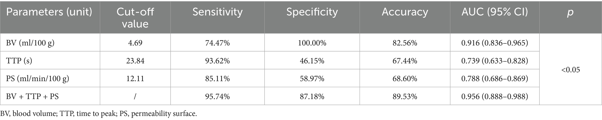Results: A total of 86 patients were included, including 45 women and 41 men. There were 47 cases in the mutation group and 39 cases in the wild-type group. A univariate analysis showed that compared with the wild-type group, blood volume (BV) (5.56 ± 1.51 vs. 3.04 ± 1.07, p < 0.001), time to peak (TTP) (29.31 ± 5.12 vs. 25.99 ± 5.68, p = 0.006), and permeability surface (PS) (18.98 ± 6.79 vs. 11.77 ± 5.56, p < 0.001) were all higher in the mutation group. No statistical differences were found in the other five quantitative parameters (p > 0.05). A multivariate logistic regression analysis identified BV (p < 0.001), TTP (p = 0.029), and PS (p = 0.014) as independent predictors of EGFR mutation. According to the ROC, the AUC of BV, TTP, and PS were 0.916, 0.739, and 0.788, respectively, and the corresponding cut-off values were 4.69, 23.84, and 12.11, respectively. The AUC of the combined predictive model (BV + TTP + PS) reached 0.956, which was superior to that of any single parameter (p < 0.05).