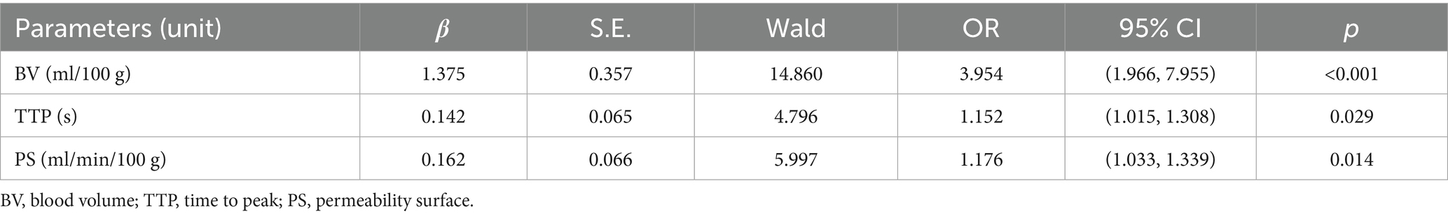 As shown in Table 5, according to the univariate analysis, we further introduced BV, TTP, and PS into the multivariate logistic regression analysis, and the results identified BV (p < 0.001), TTP (p = 0.029), and PS (p = 0.014) as independent predictors of EGFR mutation.