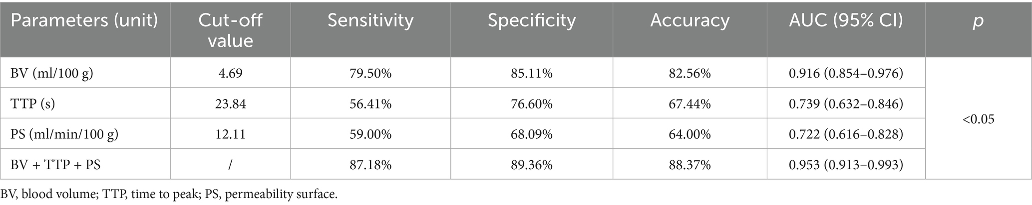 By prospectively analyzing CTPI parameters in 86 patients with NSCLC, our study revealed that BV, TTP, and PS in the EGFR mutation group were significantly higher than those in the wild-type group, which was similar to the principle and conclusion of CT perfusion parameters in distinguishing benign and malignant pulmonary nodules and predicting the prognosis of chemotherapy in patients with NSCLC (29, 30). The multivariate logistic regression analysis showed that BV, TTP, and PS were all independent predictors of EGFR mutations. BV is a parameter that directly reflects BV of the lesion and is determined by the density of the capillary network. Since tumors have high oxygen demand and EGFR mutation increases internal neovascularization, the capillary network density of NSCLC is high with a rich blood supply (31), resulting in elevated BV values. Consistent with Deng et al. (32), who reported that peripheral lung cancer had a higher BV than focal organizing pneumonia, this study proved that the EGFR mutation group possessed a higher BV. The ROC analysis for the assessment of diagnostic performance showed that the AUC of BV was 0.916, suggesting its good predictive power. Using a BV greater than 4.69 mL/100 g as the cut-off value for possible EGFR gene mutation in NSCLC, the sensitivity, specificity, and accuracy were 74.47, 100, and 82.56%, respectively. TTP refers to the time required for the concentration of contrast medium to reach its peak value when passing through the capillaries, and theoretically, as the number of open capillaries increases, blood flow becomes larger, and then, TTP shortens after EGFR mutation. However, this study found that the TTP of the EGFR mutation group was longer than that of the wild-type group, which may be related to the following reasons: first, after EGFR mutation, extensive neovascularization occurred, characterized by intricate luminal configurations and relatively narrow vessel diameters. Second, due to the activation of VEGF, the extracellular matrix undergoes denaturation, which may, to some extent, hinder blood flow within the lumens of small blood vessels. Finally, most lung tumors receive blood supply from both the bronchial artery and the pulmonary artery. The enhancement phase of the bronchial artery typically occurs later than that of the pulmonary artery. In tumors harboring EGFR mutations, the bronchial artery may serve as the predominant source of vascular supply. Based on the possible factors mentioned above, the time to reach its peak for the contrast agent in the tumor increases in the EGFR mutation group. Several studies using TTP to distinguish benign from malignant pulmonary nodules have concluded similarly (33, 34). The AUC of TTP was 0.739, and the cut-off value was 23.84 s, that is, TTP longer than 23.84 s might point out possible EGFR mutation, and the sensitivity, specificity, and accuracy were 93.62, 46.15, and 67.44%, respectively. PS is a parameter that directly reflects capillary permeability in the lesion. EGFR mutations promote the activation of VEGF, which potently increases vascular permeability through the action of small vesicular organelles and provokes the action of VEGFR-3 factors to alter extracellular matrix properties, making it easier for vascular growth and metastasis. The results of this study showed that PS in the EGFR mutation group was significantly higher than that in the wild-type group, which was consistent with a previous study on the predictive ability of PS in different histological subtypes of lung cancer (35). The AUC of PS was 0.788, and when PS is considered to be greater than 12.11 mL/min/100 g as a cut-off value in predicting EGFR, the sensitivity, specificity, and accuracy were 85.11, 58.97, and 68.60%, respectively. According to these results, it could be found that each independent predictor had its own limitations in predicting EGFR mutation, for instance, the sensitivity of BV and the low specificity and accuracy of TTP and PS. As a consequence, we constructed a combined prediction model of BV, TTP, and PS and found that the AUC of the combined predictive model (BV + TTP + PS) for EGFR mutation reached 0.956, and its sensitivity, specificity, and accuracy were 95.74, 87.18, and 89.53%, respectively. The predictive performance of the combined model was superior to that of any single parameter.