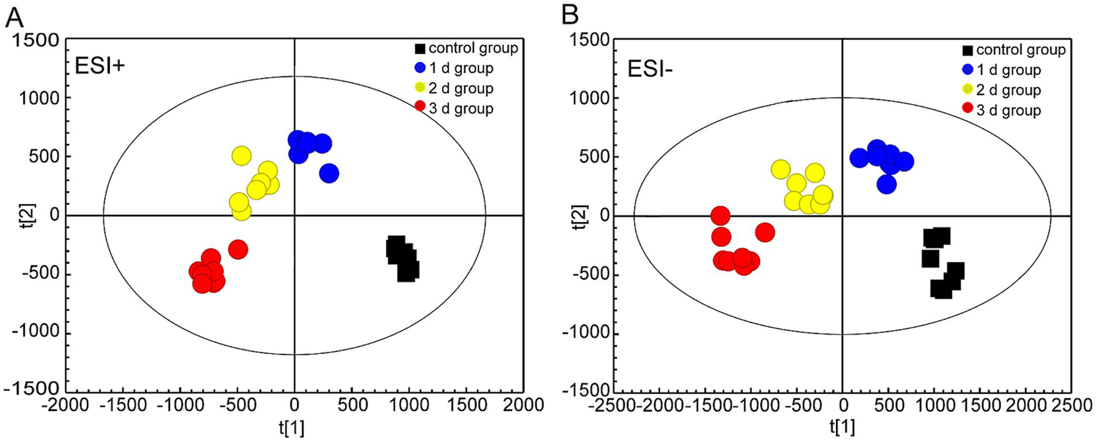 ![Two scatter plots labeled A and B show group separation in ESI positive and negative modes on t[1] and t[2] axes. Color-coded groups include control (black squares), 1 day (blue circles), 2 days (yellow circles), and 3 days (red circles). Each group clusters distinctly within ellipses.](https://www.frontiersin.org/files/Articles/1661063/xml-images/fmed-12-1661063-g002.webp)