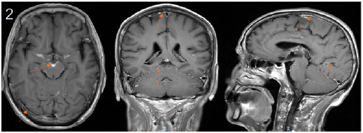 Upon transfer to our department, the existing anti-infective regimen was maintained, and a comprehensive diagnostic workup was initiated. Cranial MRI demonstrated multiple areas of leptomeningeal enhancement (Figure 2). Lumbar puncture revealed an elevated opening pressure of 240 mmHâ‚‚O. CSF analysis showed marked pleocytosis, elevated protein, and decreased glucose and chloride levels. Cytological examination identified abundant small lymphocytes, suggestive of CNS involvement by lymphoma (Table 2). mNGS of the CSF detected microbial genomes corresponding to Cryptococcus neoformans (77.78% relative abundance) and Pseudomonas aeruginosa (28.57% relative abundance). No pathogenic autoantibodies associated with autoimmune encephalitis were detected. Additionally, CSF smear confirmed the presence of Cryptococcus neoformans, and the CrAg was positive.