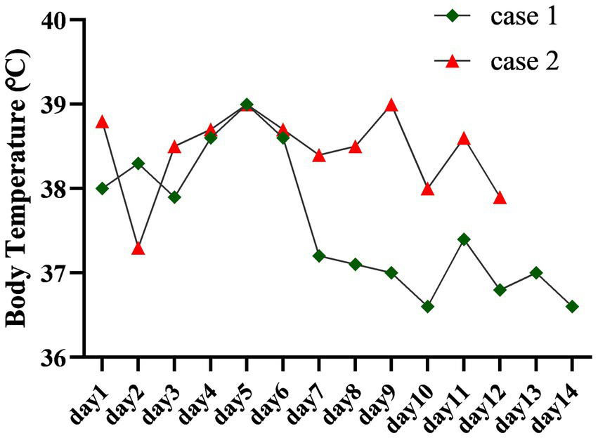 The figure traces the body temperature profiles of two patients throughout their hospitalization. Case 1 exhibited fever resolution following treatment, whereas the fever in Case 2 proved refractory and persisted.