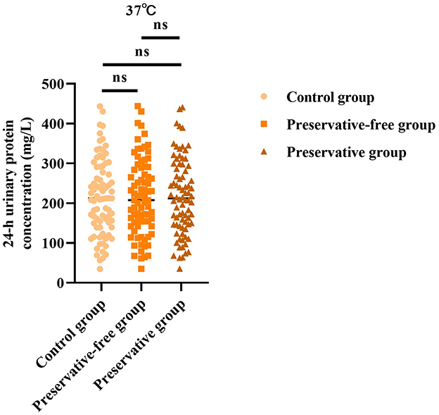 Based on the results of the control group, there was no statistically significant difference in the 24-h urine protein concentration between the group using preservatives and the group not using preservatives at 37 °C (F = 0.006, P = 0.993; Figure 1). This indicated that, even without the use of preservatives, when urine samples were placed in an environment at 37 °C, the quantitative determination results of urine protein concentration were not affected.