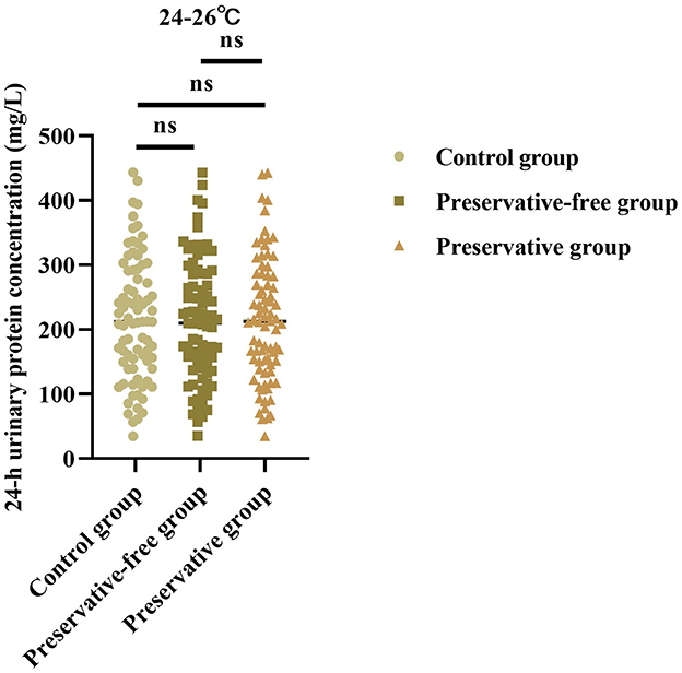 Based on the results of the control group, there was no statistically significant difference in the 24-h urine protein concentration between the group using preservatives and the group not using preservatives at 24–26 °C (F = 0.013, P = 0.987; Figure 2). This indicated that, even without the use of preservatives, when urine samples were placed in an environment at room temperature, the quantitative determination results of urine protein concentration were not affected.