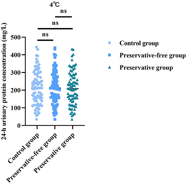 Based on the results of the control group, there was no statistically significant difference in the 24-h urine protein concentration between the group using preservatives and the group not using preservatives at 4 °C (F = 0.022, P = 0.977; Figure 3). This indicated that, even without the use of preservatives, when urine samples were placed in a refrigerated condition, the quantitative determination results of urine protein concentration were not affected.