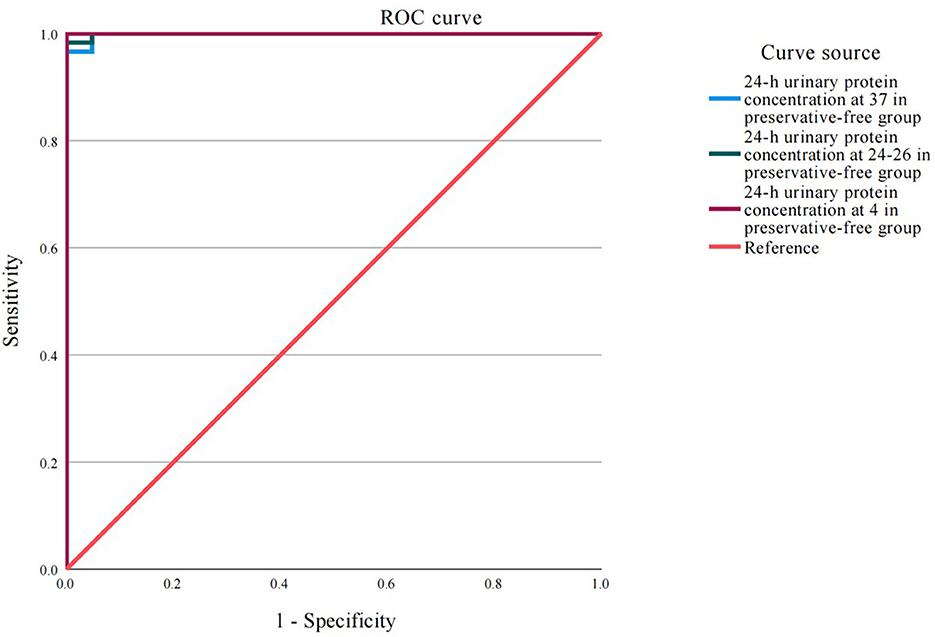Results: Based on the results of the control group, there was no statistically significant difference in the 24-h urine protein concentration between the preservative group and the group without preservatives at 37, 24–26 or 4 °C (F = 0.006, P = 0.993; F = 0.013, P = 0.987; F = 0.022, P = 0.977). The results of the ROC analysis indicated excellent diagnostic accuracy for proteinuria detection across all storage conditions (AUC: 0.992–0.994). The accuracy of urine samples stored without preservatives was comparable to, and in some cases (e.g., at 4 °C) exhibited perfect specificity (100%) alongside high sensitivity (97.4%), matching the direct detection in the control group.