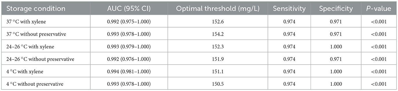 The results of our comprehensive ROC analysis provide robust statistical evidence supporting the main findings. The exceptionally high AUC values (all >0.99), coupled with consistently high sensitivity (97.4%) and specificity (reaching 100% in three out of six conditions), indicate that the urine protein quantification is remarkably stable under various storage scenarios. Crucially, the performance metrics for samples stored without any preservative were virtually identical to those preserved with xylene. This finding is particularly significant as it demonstrates that the simple omission of a preservative does not compromise the analytical integrity of the 24-h urine protein test, even when samples are stored at room temperature for 24 h. Therefore, this study reaches the following conclusion: the 24-h urine protein test samples can be stored at room temperature without the need for the addition of preservatives. If due to instrument failure or other reasons, timely testing cannot be conducted, it is recommended to store them in a refrigerated environment to extend their shelf life and improve the accuracy of the 24-h urine protein test results. Consistent with our findings, studies have shown that even when sodium chloride preservatives were added to the urine, the measurement results of urinary protein and microalbumin in 24-h urine did not show significant improvement. Moreover, even without adding preservatives to the urine, the test results still had a good correlation with the standard measurement results (27).