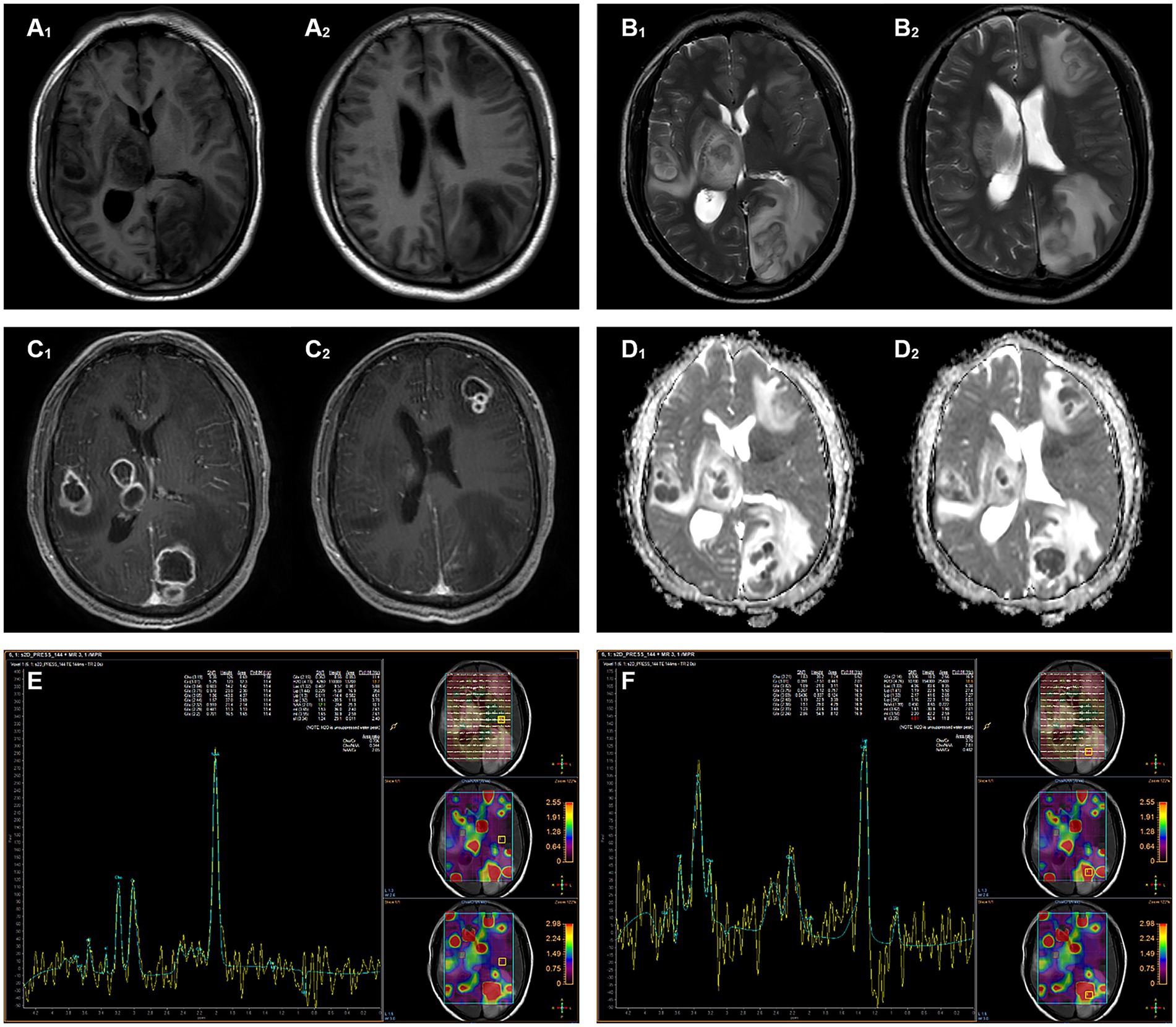 Figure 1. Magnetic resonance imaging shows multiple intracranial lesions. (A₁,A₂) The lesion areas demonstrate hypointense and isointense on T1WI. (B₁,B₂) The lesion areas demonstrate hyperintense and isointense on T2WI. (C₁,C₂) The signal intensity of the ring wall was increased after enhancement. (D₁,D₂) DWI hyperintensity with ADC hypointensity, the lesion shows true diffusion restriction. (E) MRS shows normal metabolite peaks within the normal area. (F) MRS of the lesion demonstrates a pathological spectrum, suggestive of abscess.