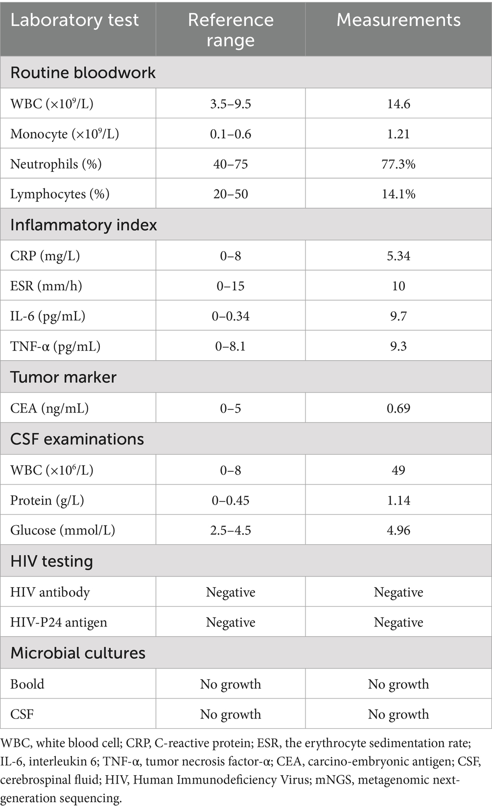Upon admission to the neurosurgery department of our hospital, a physical examination showed dysarthria, slow response, and limited cooperation. The neurological assessment demonstrated decreased muscle tone in the left upper and lower extremities with grade 4 muscle strength and a hemiplegic gait. The relevant laboratory test results are presented in Table 1.