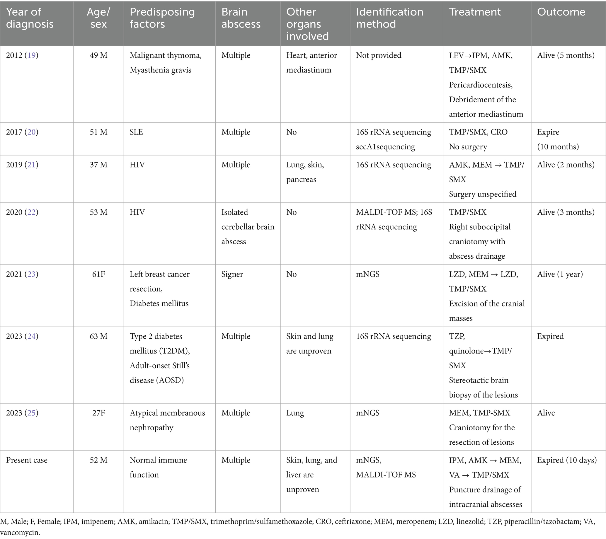 Nocardiosis is an acute or chronic suppurative or granulomatous disease caused by Nocardia bacteria, which is commonly observed in immunocompromised hosts, such as cancer patients, organ transplant recipients, and HIV-positive patients (17). Generally, HIV positivity indicates an immune deficiency, while HIV negativity indicates a normal immune status. Although Nocardia is considered an opportunistic pathogen, studies have shown that approximately one-third of cases have no underlying predisposition (18). In this case, the patient exhibited normal immune function with no risk factors for immunocompromise, consistent with Heer H. Mehta et al.’s observation that immune status is not the only determinant for infection with Nocardia (17). Our study is the first reported case of multiple brain abscesses caused by N. asiatica since 2010 in an immunocompetent individual without underlying disease (Table 2) (19–25).