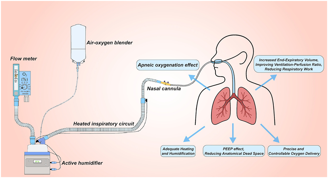 Figure 1. Setup for high-flow nasal cannula (HFNC) oxygen therapy. The system uses an air-oxygen blender to deliver controlled oxygen concentrations (FiO2) from 0.21 to 1.0 at up to 60 L/min flow. The gas is heated and humidified through an active humidifier, delivered via a heated inspiratory circuit, and administered through large-diameter nasal cannulas. This setup provides several benefits: (1) no-breathing oxygenation effect; (2) PEEP Effect, reducing anatomical dead space; (3) increased End-Expiratory Volume, improving ventilation-perfusion ratio and reducing respiratory work; (4) precise and controllable oxygen delivery; (5) adequate heating and humidification to optimize patient comfort and respiratory function.