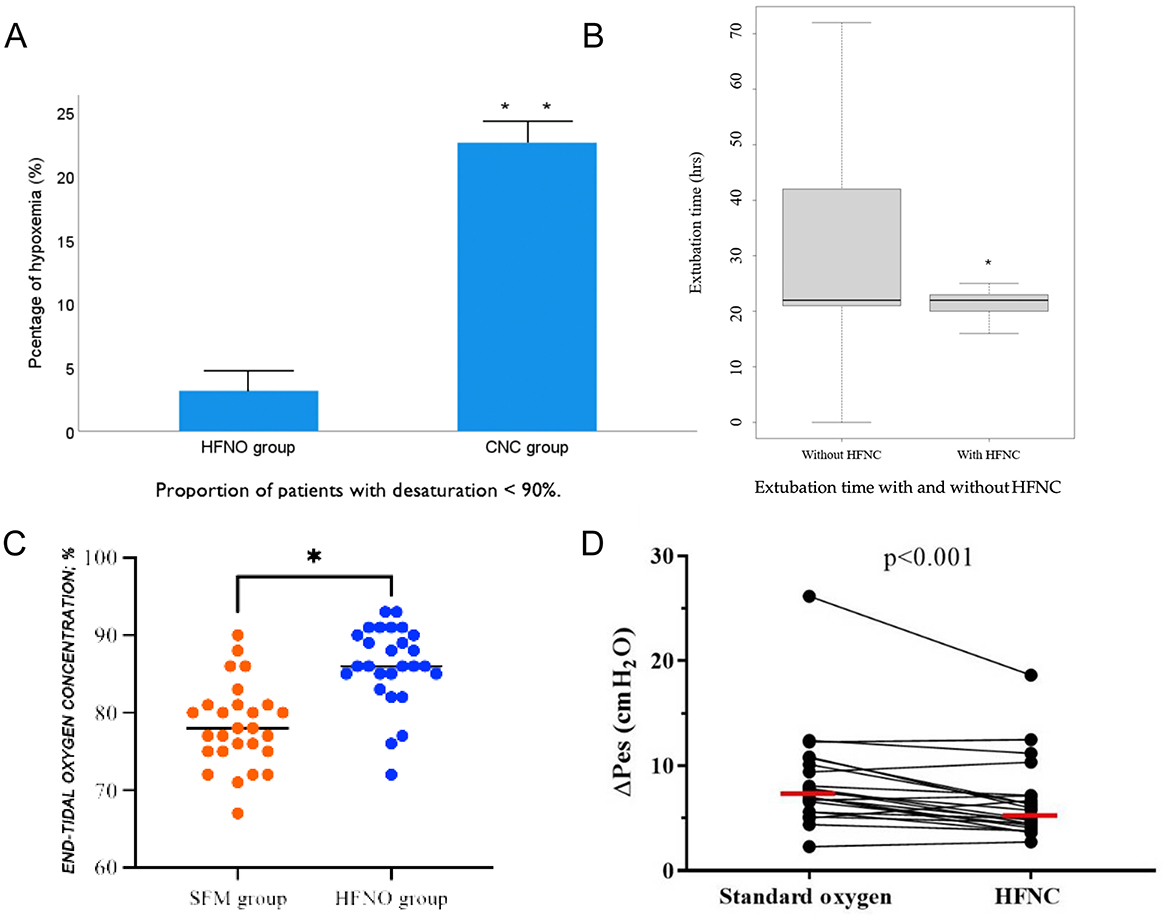 Figure 2. (A) HFNO significantly reduces the risk of post-extubation hypoxemia, especially in patients sensitive to oxygen levels (66). (B) HFNO significantly shortens extubation time and results in more consistent and stable extubation durations (75). (C) HFNO significantly increases end-tidal oxygen concentration (EtO2), reducing the risk of hypoxemia in high-risk parturients (90). (D) HFNC oxygen therapy after extubation reduces the work of breathing, suggesting advantages in lowering metabolic load and respiratory effort. The horizontal red line represents the median (35). *Indicates statistical significance (*p < 0.05, **p < 0.01).