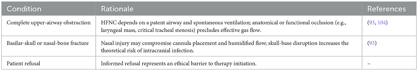 HFNC therapy is now used across a spectrum of peri-operative scenarios, including management of acute hypoxaemic respiratory failure, post-extubation support, pre-oxygenation before tracheal intubation or bronchoscopy, rescue of early postoperative respiratory compromise, and the intrahospital transfer of critically ill patients (43–45). HFNC is unsuitable when upper-airway obstruction or severe anatomical distortion precludes effective flow delivery, or in situations of life-threatening hypoxaemia, marked haemodynamic instability, facial or skull-base trauma, and untreated pneumothorax. Caution is also advised in patients with depressed consciousness, congenital cardiac shunts, acute bronchospasm, or chronic hypercapnic respiratory failure (14, 46, 47).