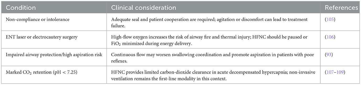 Although HFNC therapy offers multiple clinical advantages, its use must be carefully considered in specific scenarios due to established contraindications. Absolute contraindications include complete upper airway obstruction, basilar skull or nasal bone fractures, and patient refusal—primarily reflecting anatomical limitations or ethical concerns. Relative contraindications encompass poor patient cooperation, procedures involving electrosurgical or laser use in the airway, elevated aspiration risk, and significant carbon dioxide retention. In these cases, individualized risk-benefit assessments are essential. Its use is limited in the settings outlined below (Tables 1, 2).