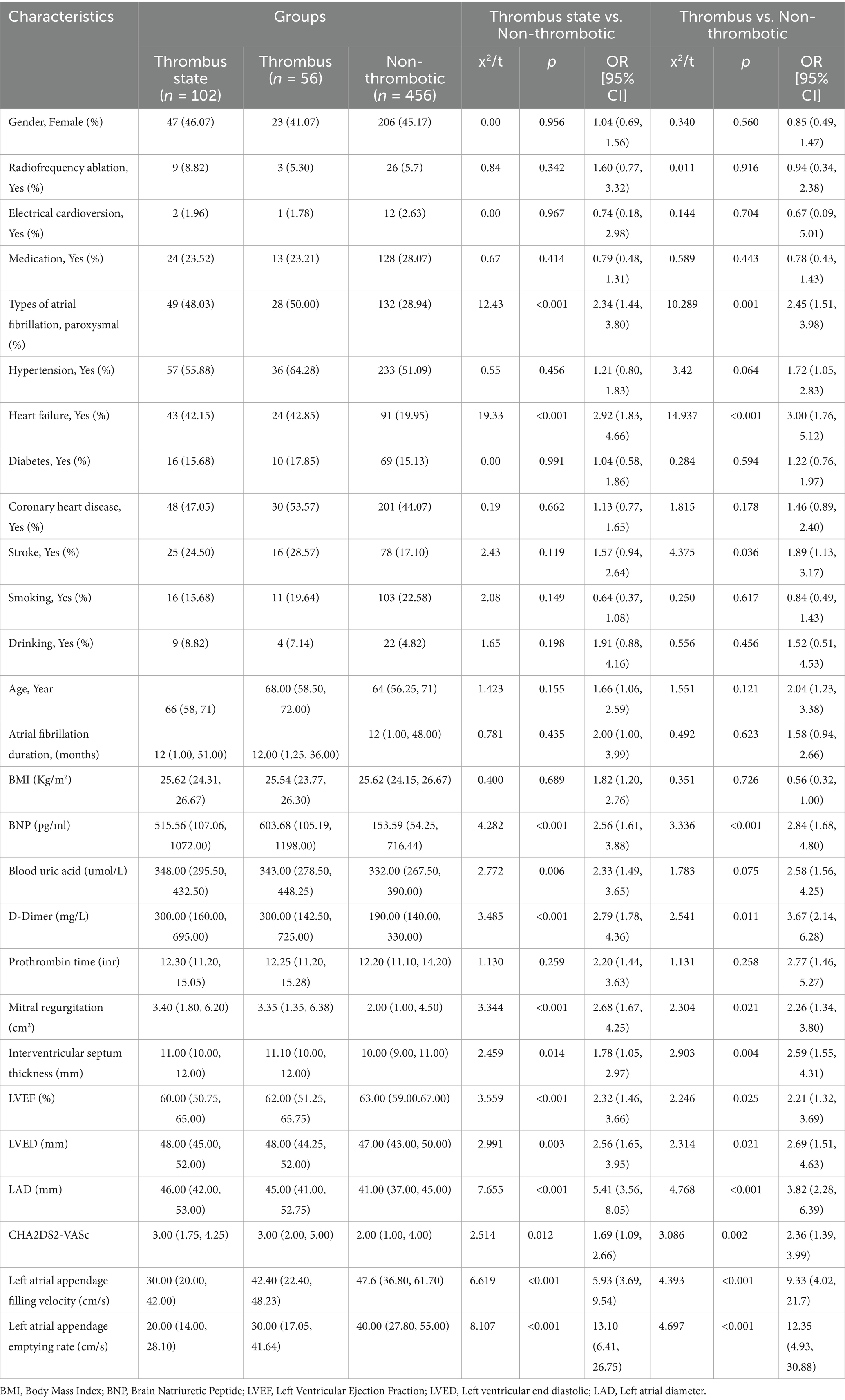 The results of the univariate analysis revealed that several clinical and echocardiographic parameters showed significant statistical differences between the LAA thrombosis group, the thrombus status group, and the no-thrombus group, when compared to those without LAA thrombosis. These factors include atrial fibrillation type, heart failure, BNP, serum creatinine, D-dimer, mitral regurgitation, LVEF, LVED, LAD, CHA2DS2-VASc score, LAA emptying velocity, and LAA filling velocity. These findings are consistent with previous studies, further confirming the importance of these clinical and echocardiographic features in the formation of LAA thrombosis (21–23). Particularly, BNP, D-dimer, and LAA functional parameters such as emptying and filling velocities are closely related to thrombosis formation and hemodynamic status (24). Additionally, the CHA2DS2-VASc score, a traditional risk assessment tool for stroke in AF patients (25), also demonstrated strong predictive ability in this study. The statistical significance of these variables suggests that LAA thrombosis is influenced not only by cardiac structural and functional abnormalities but also by various hemodynamic and coagulation factors, thus providing a solid theoretical foundation for the development of predictive models.