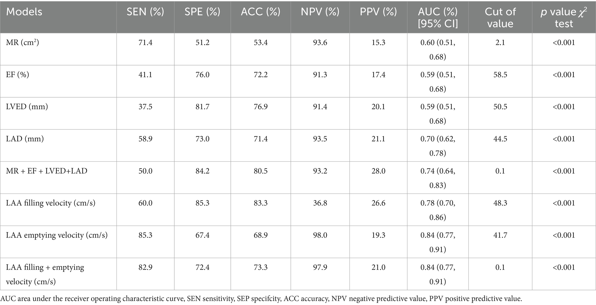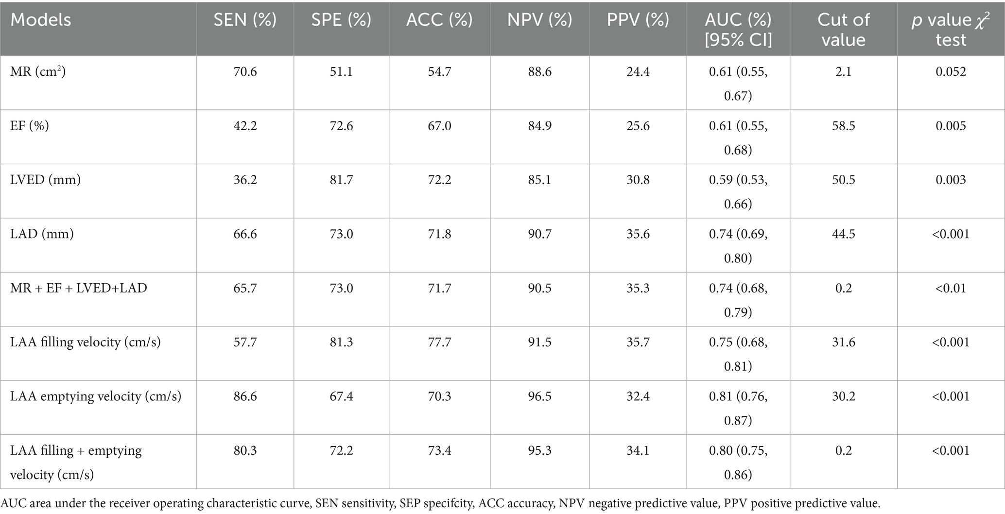 In this study, both single and combined models using TTE and TEE demonstrated their potential in predicting LAA thrombosis and thrombus status. When compared to the no-thrombus group, the combined TTE model (including mitral regurgitation, LVEF, LVED, and LAD) showed improvements in diagnostic sensitivity, specificity, and AUC in the thrombus status group (sensitivity 65.7%, specificity 73.0%, AUC 0.74). The combined TEE model, based on LAA emptying and filling velocities, showed even higher diagnostic performance in the thrombus status group (sensitivity 80.3%, specificity 72.2%, AUC 0.80). Moreover, compared to the thrombus group, the diagnostic sensitivity, specificity, and AUC of the combined TEE model also showed significant improvements (sensitivity 82.9%, specificity 72.4%, AUC 0.84). These results not only align with existing research but also reaffirm the gold standard status of TEE for diagnosing LAA thrombosis. However, it is important to note that while TEE has stronger diagnostic capability, its invasiveness and technical demands make TTE a more practical and convenient screening tool, especially for routine clinical use. Therefore, by comparing these two methods, our study highlights the complementary nature of different echocardiographic techniques in thrombosis prediction, laying the groundwork for more refined modeling approaches to enhance diagnostic efficacy.
