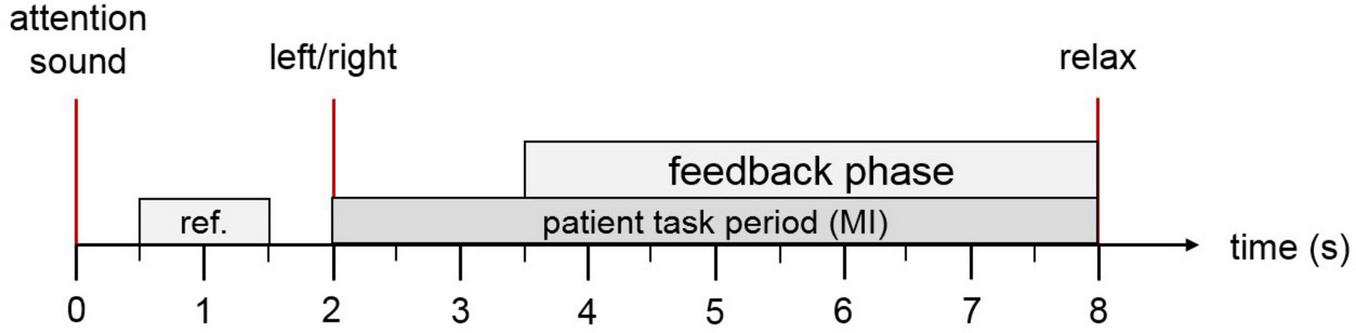 Trial overview: Each trial begins with an auditory cue to capture the patient’s attention. At the 2-s mark, an arrow appears on the screen indicating whether the patient should imagine movement of the ankle or hand, accompanied by a verbal instruction in the patient’s native language. If the motor imagery is correctly detected, both the virtual avatar and the functional electrical stimulation (FES) system are activated to provide visual and physical feedback. At second 8, a relaxation cue signals the end of the trial.