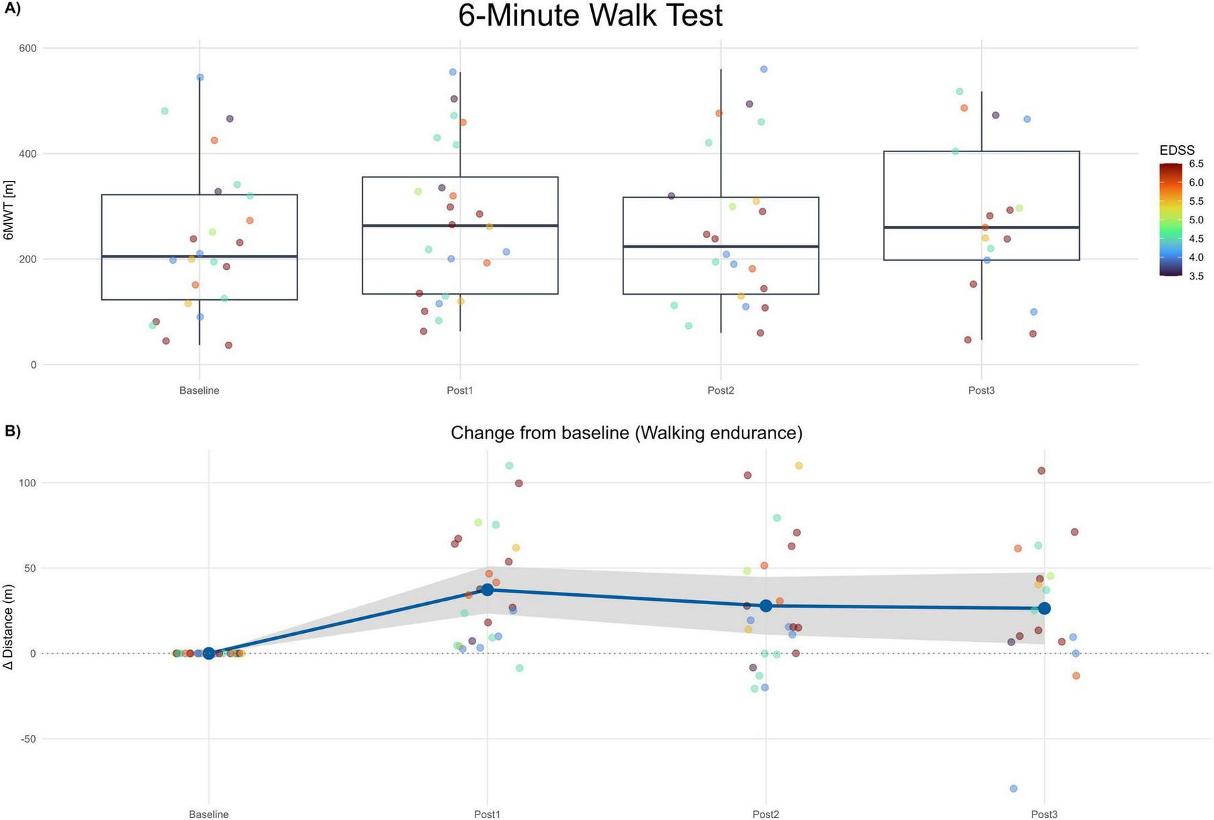 6-minute walk test (6MWT). (A) Boxplots of 6MWT distance (meters) at Baseline and each post-assessment (Post1–Post3). Points show individual participants; point color encodes EDSS (imputed). (B) Change from baseline in 6MWT distance (Δ meters) across post-assessments. The blue line depicts the mean change and the gray band the 95% confidence interval. Positive values indicate improvement.