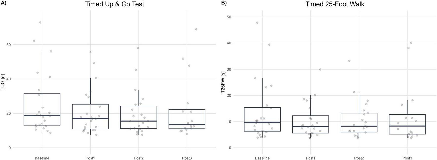 Gait speed and mobility tests. (A) Timed Up and Go (TUG, seconds) at Baseline and each post-assessment (Post1–Post3). (B) Timed 25-Foot Walk (T25FW, seconds) at Baseline and each post-assessment. Boxplots summarize distributions; dots represent individual participants. Lower values indicate better performance.