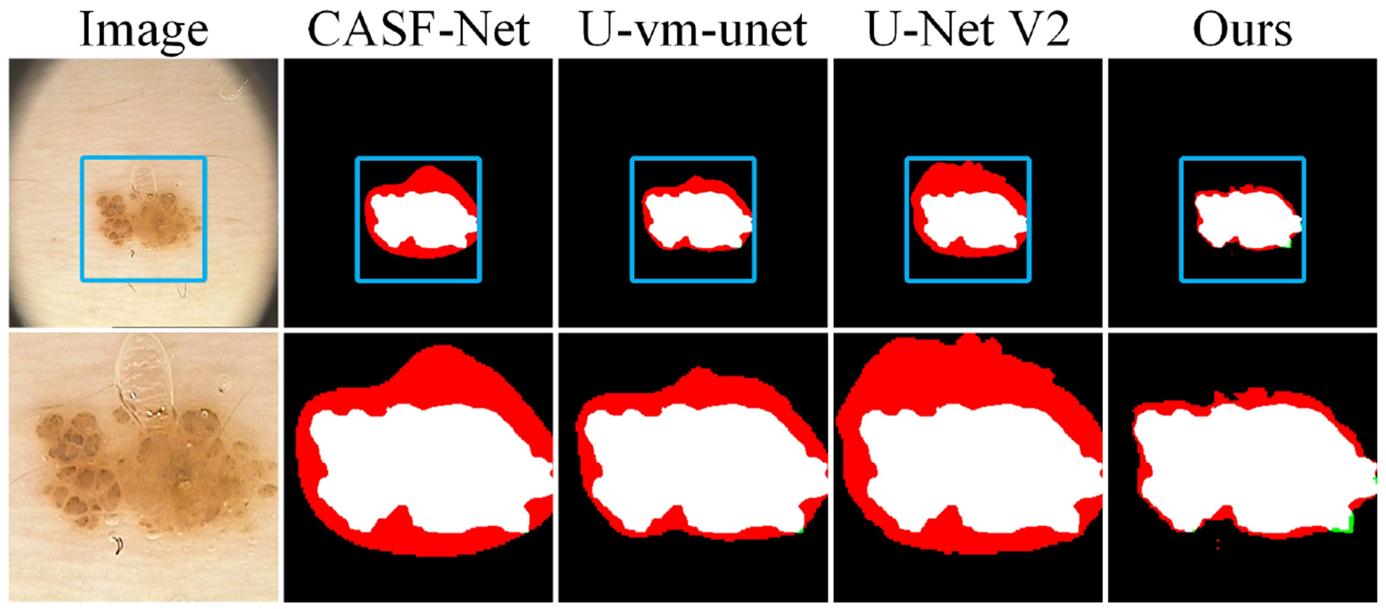 To evaluate model performance on small targets and in noisy environments, we conducted local zoom-in comparisons on representative samples, as shown in Figure 6. DCSAU, U-vm-unet, and U-Net V2 often misidentify background textures as lesion regions, especially when boundaries are blurred or targets are irregular. This suggests limited robustness to noise and weak discrimination in challenging cases. In contrast, Ours better distinguishes true lesions from noisy backgrounds and successfully detects small, low-contrast targets. Despite minor boundary errors, it shows stronger resistance to noise and improved sensitivity to fine-grained lesion structures.