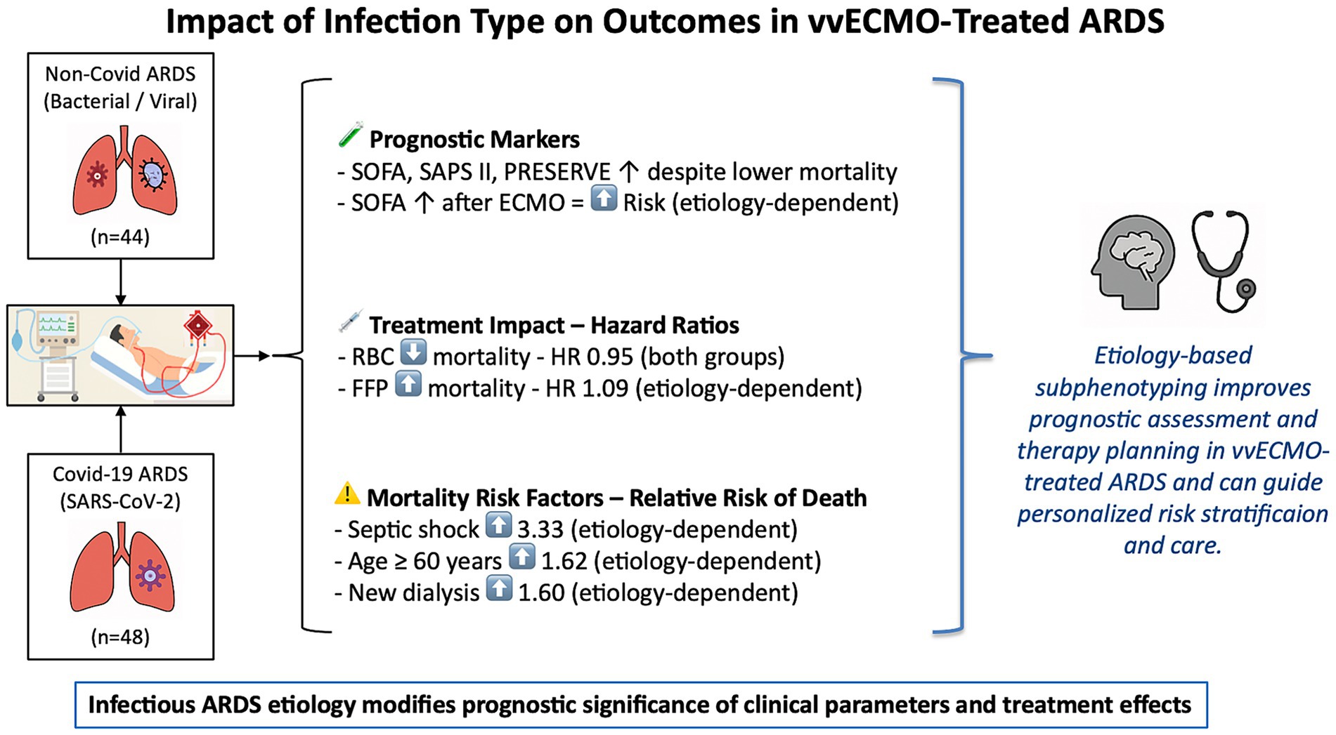 Figure 1. Graphical abstract illustrating the impact of ARDS etiology on prognosis and treatment effects in vvECMO. This figure summarizes the findings of a comparative analysis of Covid-19 and Non-Covid-19 ARDS patients treated with venovenous extracorporeal membrane oxygenation (vvECMO). It highlights key prognostic markers and treatment-associated risk modifiers, such as SOFA score dynamics, transfusion effects, and the etiology-dependent significance of septic shock, age, and renal failure. The results support the concept that infectious etiology influences both outcome prediction and therapeutic response, underlining the value of etiology-based subphenotyping for personalized care in ECMO-treated ARDS. ARDS, Acute Respiratory Distress Syndrome; HR, Hazard ratio; SOFA, Sepsis-related organ failure assessment score; SAPS II, Simplified Acute Physiology Score II; PRESERVE, prediction of death in severe ARDS using the vvECMO score; ECMO, extracorporeal membrane oxygenation; RBC, packed red blood cells; FFP, fresh frozen plasma.