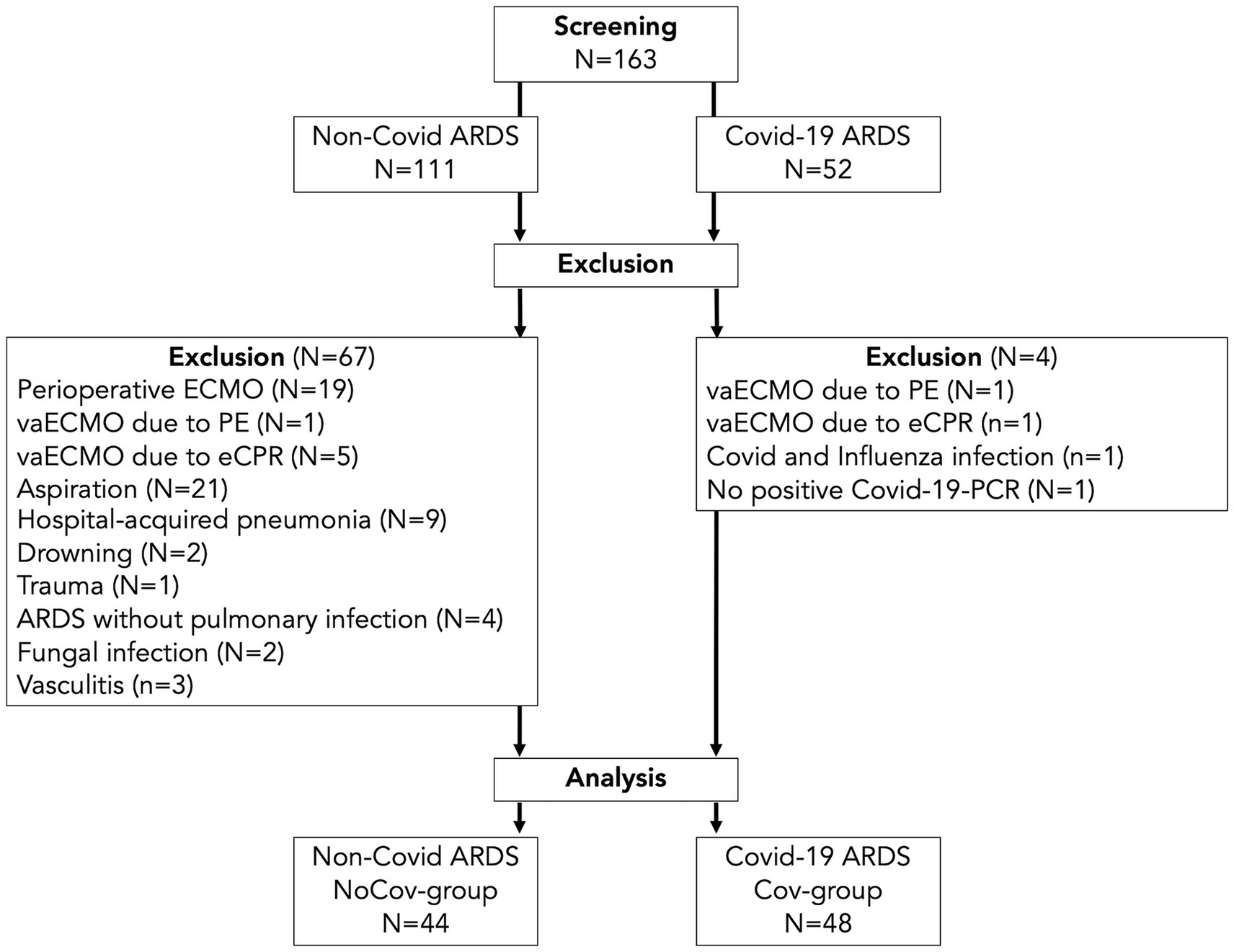 Figure 2. Flow chart of the patient population. In the Cov group, four patients were excluded: two with vaECMO for pulmonary embolism or eCPR, one with synchronous infection with Covid-19 and influenza, and one with missing detection via PCR. In the NoCov group, 67 patients were excluded: six patients with vaECMO for pulmonary embolism or eCPR; 19 patients with perioperative ECMO for planned surgery; 32 patients with aspiration, hospital-acquired pneumonia and drowning; one patient with ECMO for lung trauma; four patients without pulmonary infection; two patients with fungal infection; and three patients with vasculitis. N = 48 patients with Covid-19 ARDS and N = 44 patients without Covid-19 ARDS were included in the analyses. vaECMO, veno-arterial ECMO; vvECMO, veno-venous ECMO; PCR, polymerase chain reaction; PE, pulmonary embolism; eCPR, extracorporeal cardiopulmonary resuscitation.