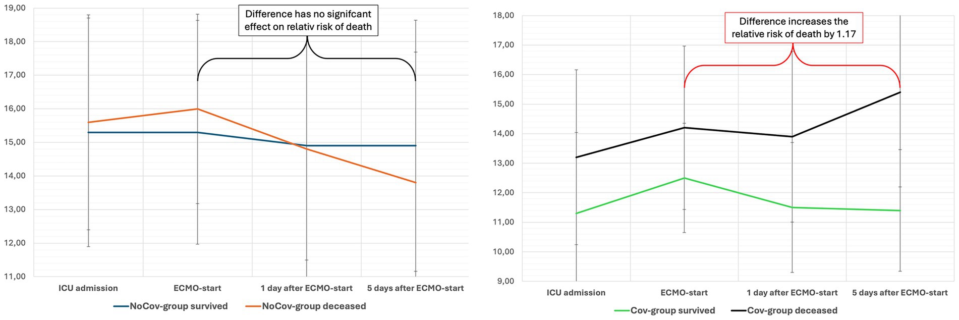 Figure 3. The evolution of the SOFA score in both ARDS cohorts after ECMO initiation. The impact of ARDS etiology on outcome prediction is illustrated by the evolution of the SOFA score within 5 days of ECMO initiation. In this study, changes in SOFA scores during the early ECMO course were analyzed to assess their association with mortality. In the Non-Covid ARDS group (left panel), non-survivors showed a nonsignificant trend toward a decrease in SOFA score. In contrast, an increase in SOFA score in the Covid-19 ARDS group (right panel) was significantly associated with a higher relative risk of death, highlighting the prognostic value of dynamic organ dysfunction—depending on ARDS etiology. The mean SOFA score and SD are shown. ICU, intensive care unit; ECMO, extracorporeal membrane oxygenation.