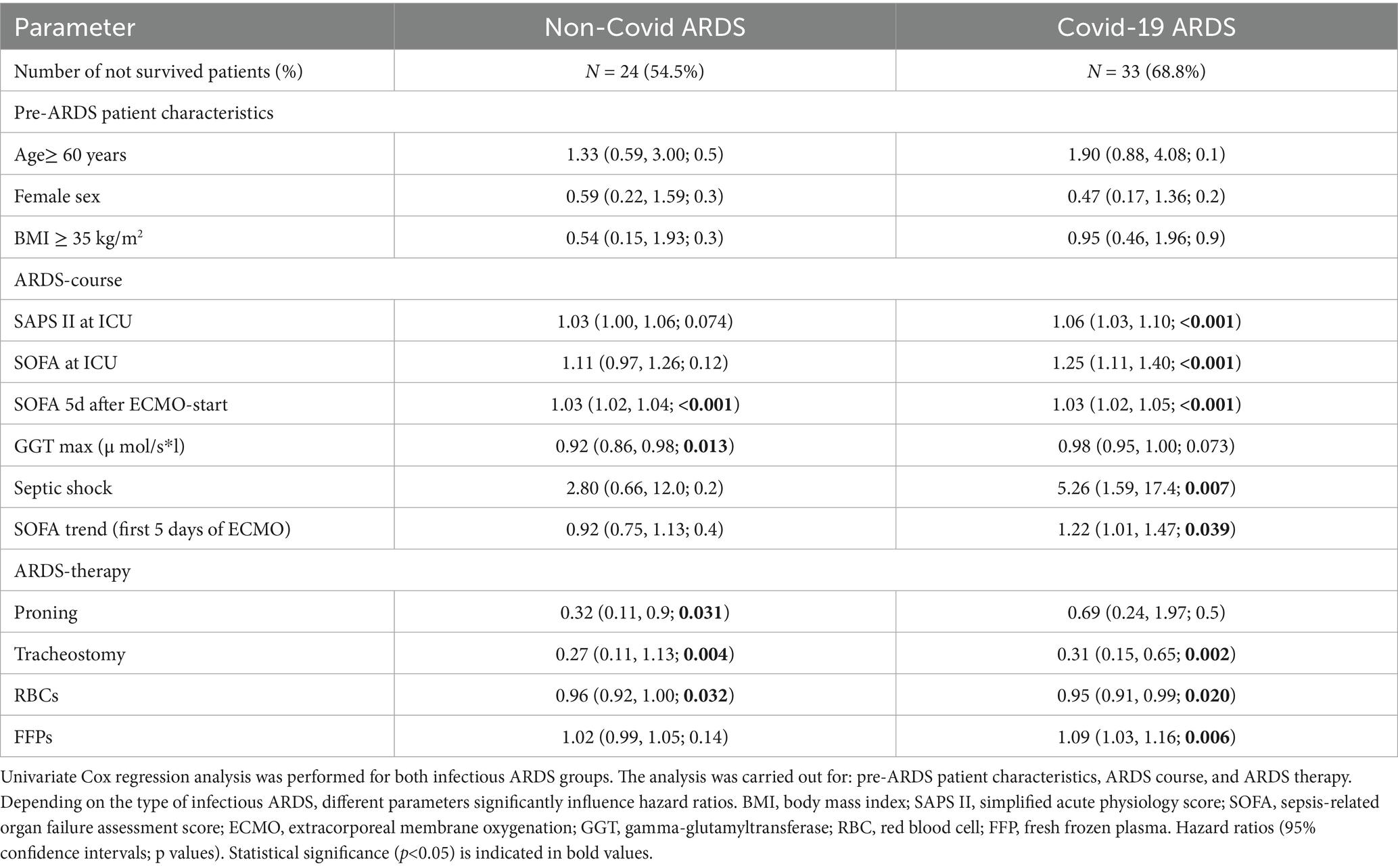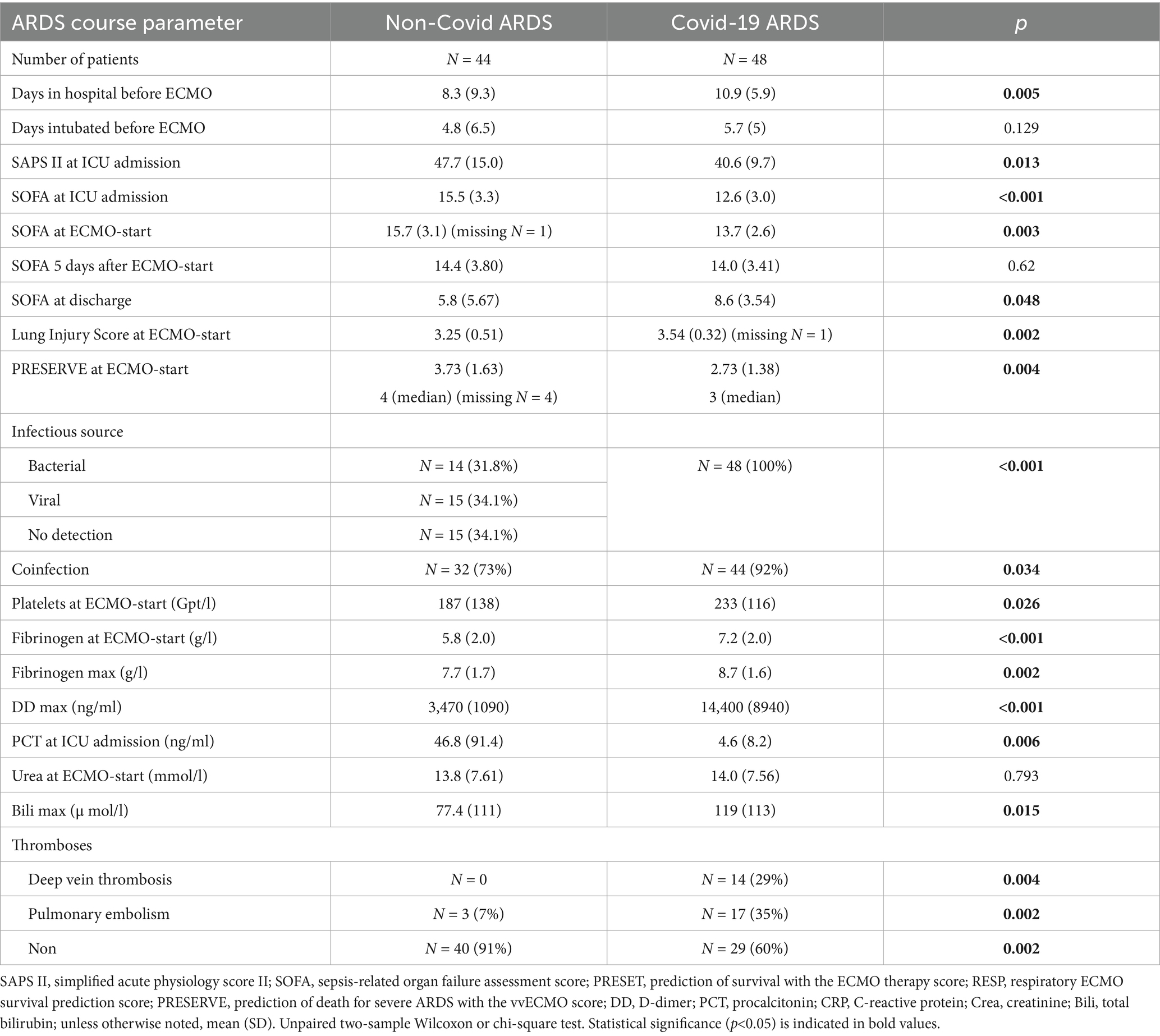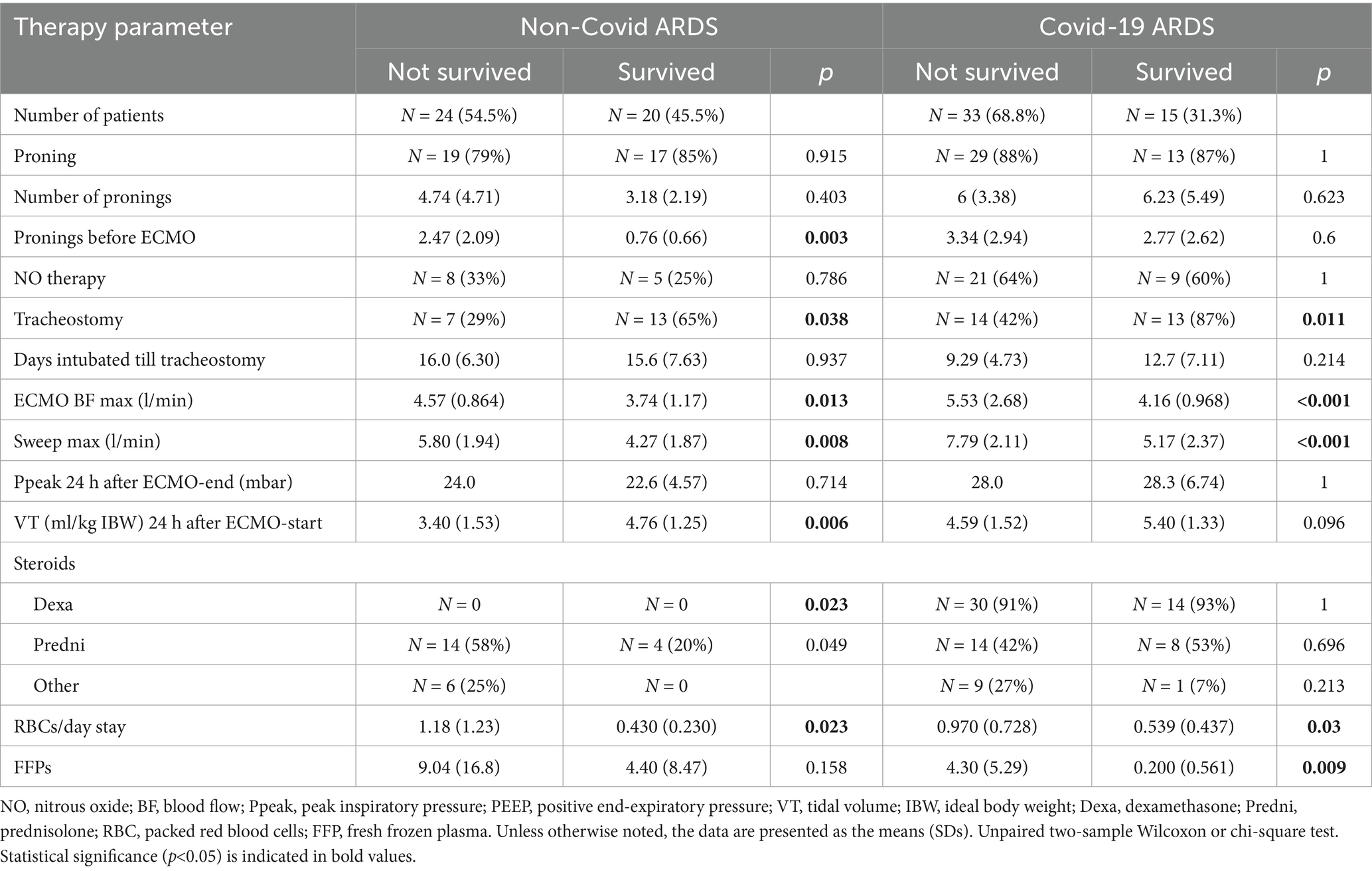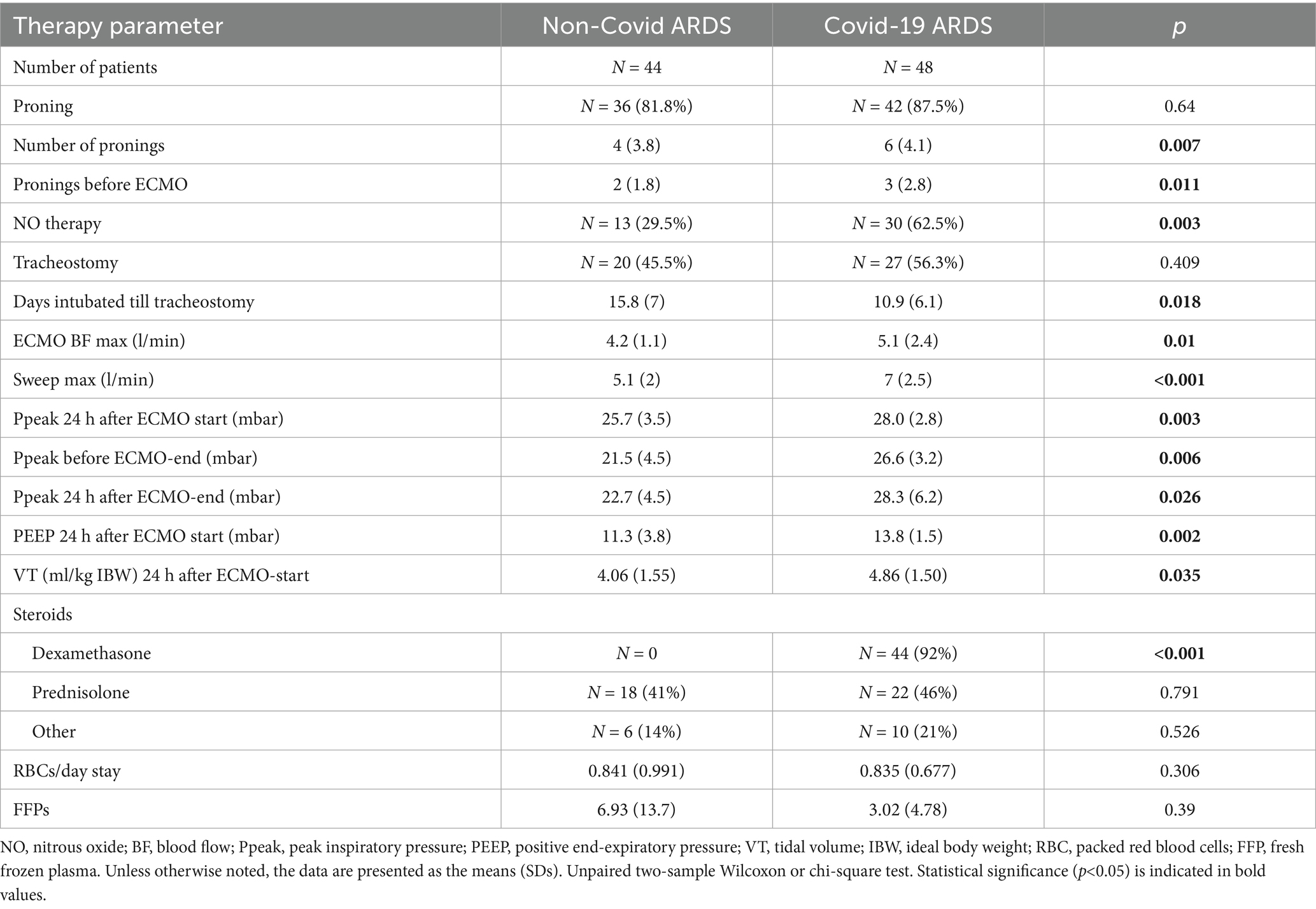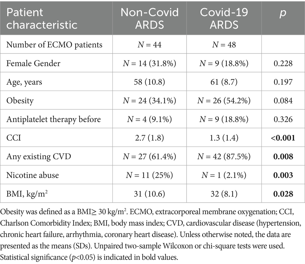 All ECMO cases at the University Hospital Dresden, Germany, from 2014 to 2021 were reviewed via the patient data management system of the intensive care unit (ICU). The medical records were reviewed by two intensivists experienced in the care of critically ill patients who were not involved in further analysis. The inclusion criteria were as follows: age ≥18 years and receiving vvECMO therapy for pulmonary infectious ARDS. To be assigned to the Non-Covid group (NoCov group), both intensivists had to independently classify the case as primary pulmonary infectious ARDS. Cases with no identified pathogen remained eligible for the Non-Covid cohort if both independent intensivists confirmed a pneumonia as cause of ARDS based on criteria according to national pneumonia guidelines (22), i.e., clinical, laboratory, and radiographic evidence, and no alternative non-pulmonary ARDS trigger was present. By contrast, cases labelled ‘ARDS without pulmonary infection’ were excluded because they did not meet pneumonia criteria or had an extrapulmonary origin of ARDS. To be assigned to the Covid group (Cov group), evidence of Covid-19 infection had to be demonstrated by a positive polymerase chain reaction (PCR) test. A lack of pathogen detection was not an exclusion criterion for the NoCov group if the criteria for pneumonia were met (22). To focus on patients with typical infectious pneumonia leading to ARDS, those with ARDS caused by aspiration, drowning, vasculitis, hospital-acquired pneumonia, or fungal infections were excluded. Additionally, patients with ARDS resulting from non-pulmonary causes, such as trauma or non-pulmonary sepsis, were not included.
