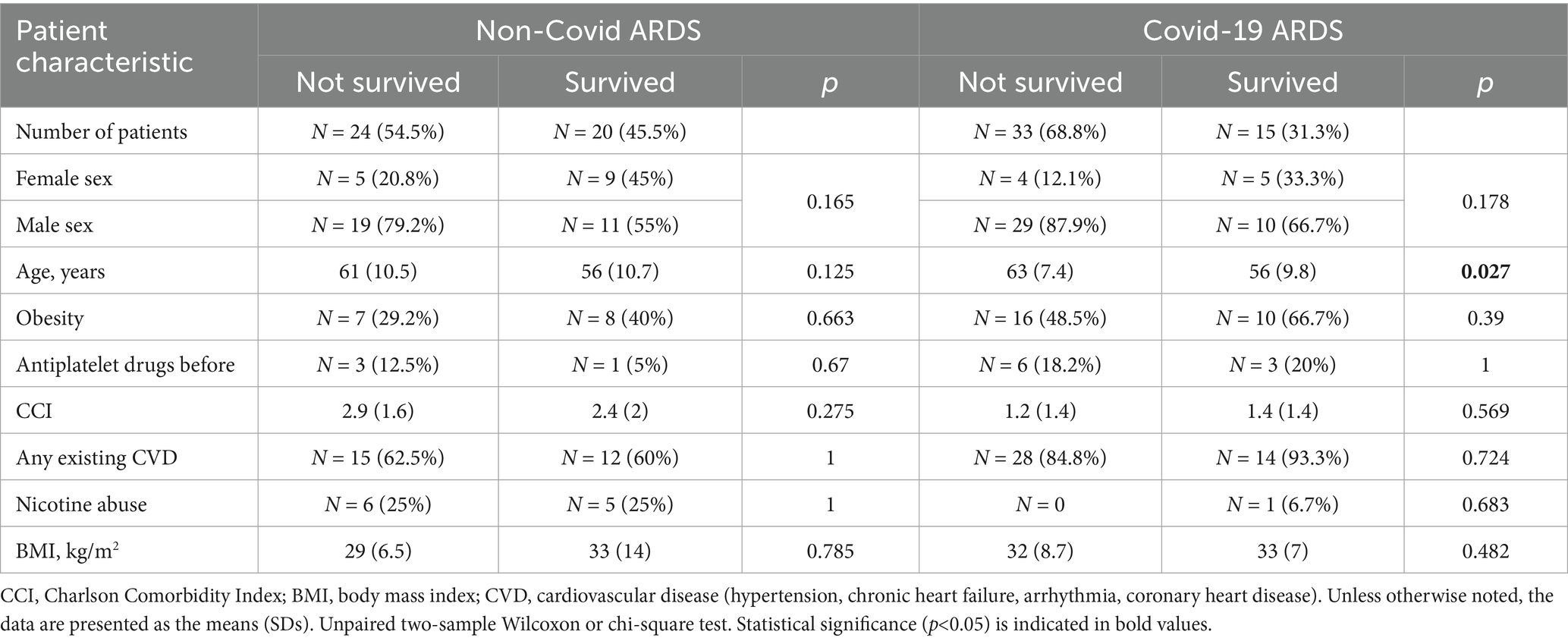 In the NoCov group, 55% of patients died; in the Cov group, 69% of patients died. Patients who died in the Cov group were significantly older (63 vs. 56 years, p = 0.027) than those who survived. In the NoCov group, age was not significantly different between deceased patients and surviving patients (61 vs. 56 years, p = 0.125). Comparisons between deceased and surviving patients within the two infectious ARDS groups revealed no significant differences regarding the following pre-ARDS characteristics: sex, obesity, antiplatelet therapy, CCI, CVD, nicotine abuse and BMI (Table 2).