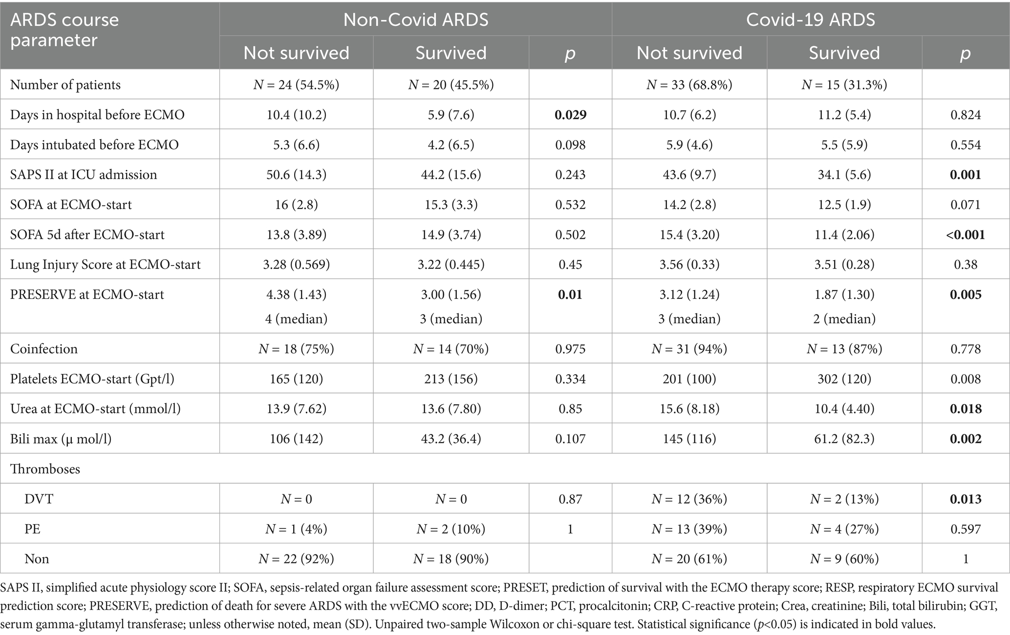 In the NoCov group, 55% of patients died; in the Cov group, 69% of patients died. Non-survivors in the NoCov group had significantly more hospital days before ECMO initiation and a higher PRESERVE score (Table 4). Other parameters describing the course of ARDS were not significantly different between deceased and surviving patients in the NoCov group (Table 4). Non-survivors in the Cov group had a higher SAPS II score at ICU admission, a higher SOFA score 5 days after ECMO initiation, a higher PRESERVE score, and lower platelets (Table 4). Comparison of the ARDS course between deceased and surviving patients within the two infectious ARDS groups revealed no significant differences between groups with respect to intubation days before ECMO, SOFA score at ICU admission and before ECMO initiation, coinfections and peak procalcitonin levels (Tables 4; Supplementary Table S4).
