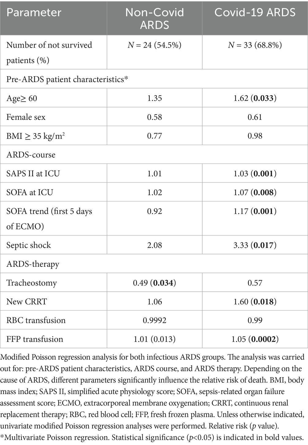 The cohort was homogeneous in terms of disease severity and critical care interventions, with all patients requiring invasive ventilation and vvECMO for severe infectious pulmonary ARDS. Among pre-ARDS characteristics, only age was associated with mortality—and only in Covid-19 ARDS patients. In this group, deceased patients were significantly older (63 vs. 56 years), and age ≥60 years was associated with an increased risk of death (RR 1.62). This aligns with findings from Tonetti et al., who reported greater age-related mortality in Covid-19 ARDS ECMO patients compared to Non-Covid patients (31), and extends previous registry data that did not differentiate by ARDS etiology (32).
