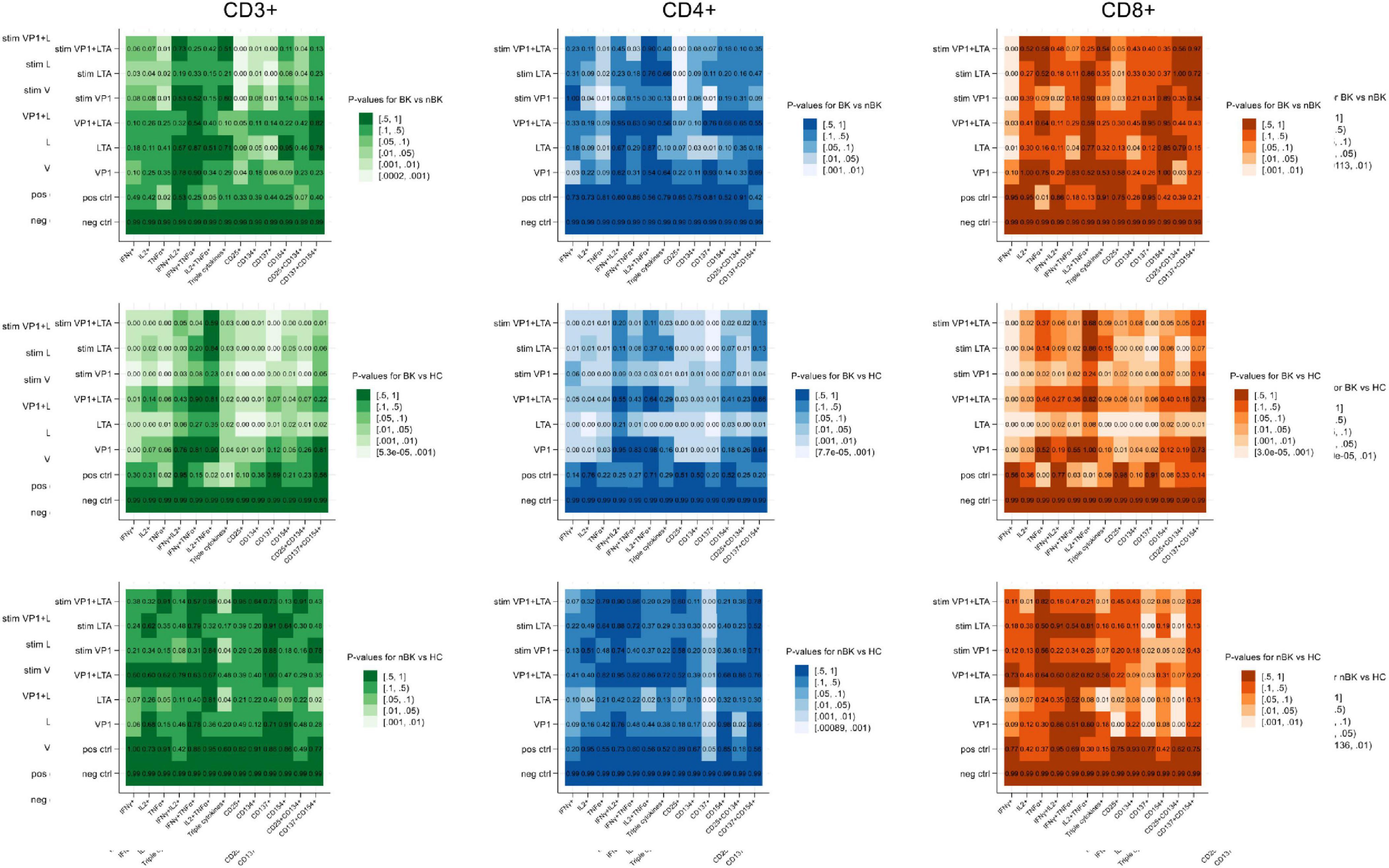 Figure 1. Heatmaps illustrating the p-values for differences in cell percentages of intracellular cytokine and surface marker expression following BKPyV antigen stimulation (Wilcoxon Rank Sum test). Patients with BKPyV viremia (BK) exhibit the lowest percentages, followed by those with non- BKPyV viremia (nBK) and healthy controls (HC). Lighter colors represent lower p-values. LTA, large T antigen; VP1, viral capsid protein 1 antigen; stim, co-stimulated with CD28 and CD49d antibodies.