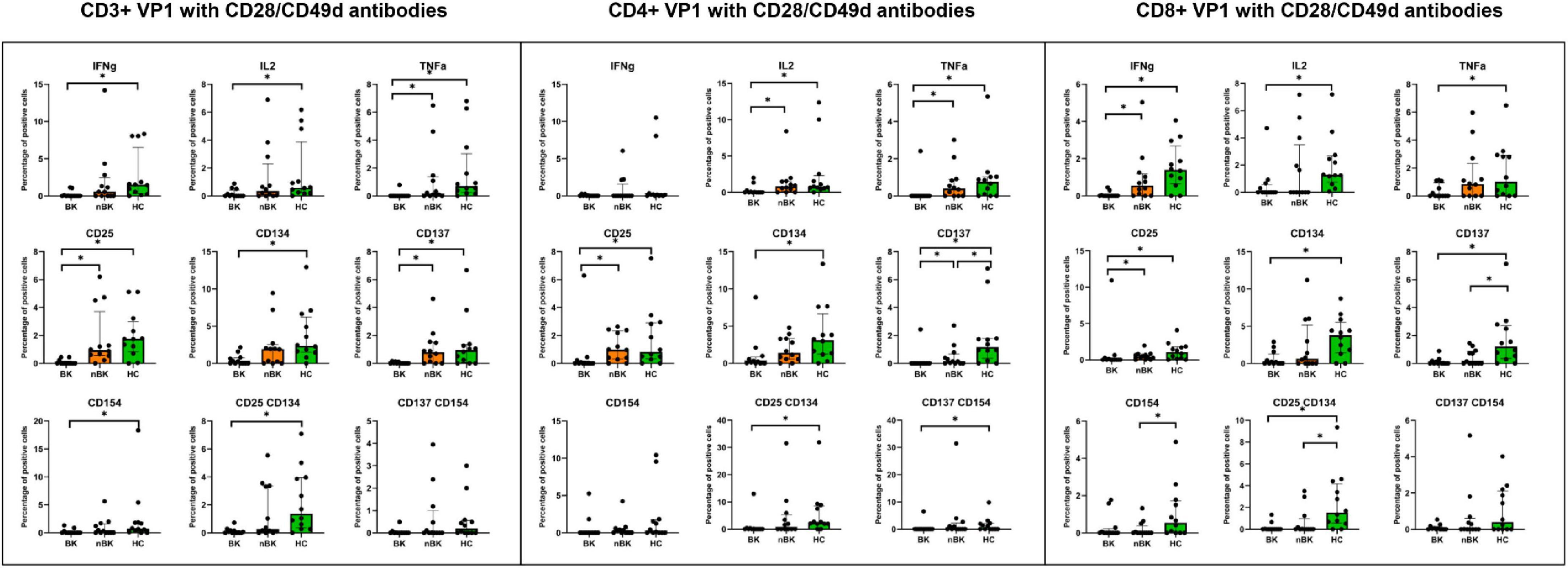 Charts compare CD3+, CD4+, and CD8+ VP1 with CD28/CD49d antibodies across groups BK, nBK, and HC. Markers include IFNg, IL2, TNFa, CD25, CD134, CD137, CD154, with significant differences indicated by asterisks. Bar charts display data distribution for cellular responses.