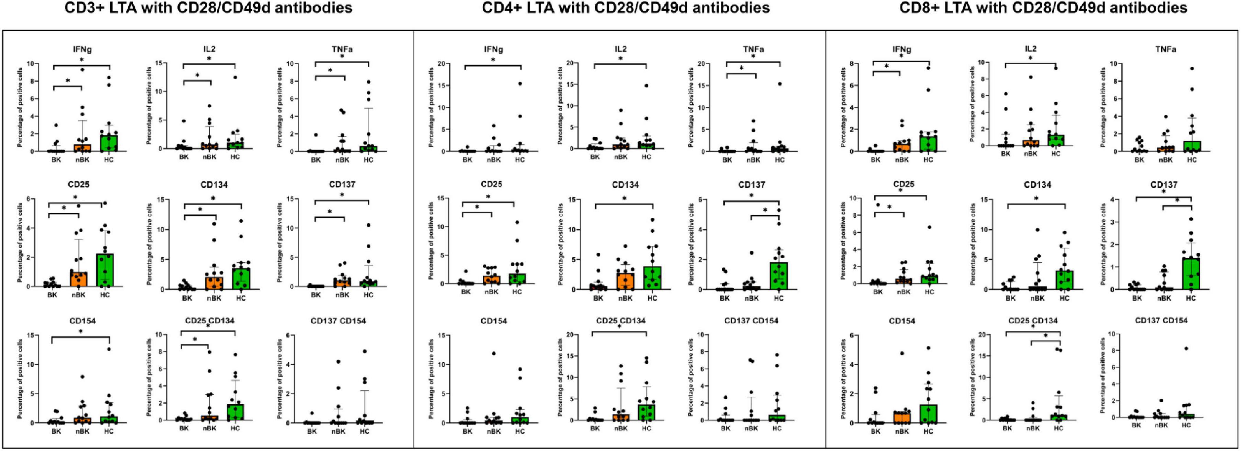 Charts compare CD3+, CD4+, and CD8+ LTA with CD28/CD49d antibodies across groups BK, nBK, and HC. Markers include IFNg, IL2, TNFa, CD25, CD134, CD137, CD154, with significant differences indicated by asterisks. Bar charts display data distribution for cellular responses.