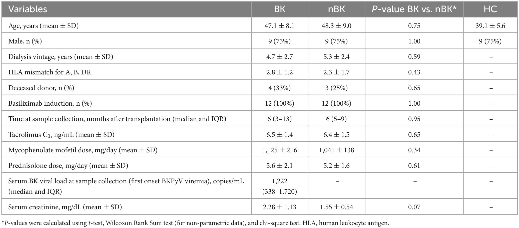 Table 1. Characteristics of kidney transplant recipients with low-level BKPyV viremia (BK; n = 12), without BKPyV viremia (nBK; n = 12), and healthy control (HC; n = 12).