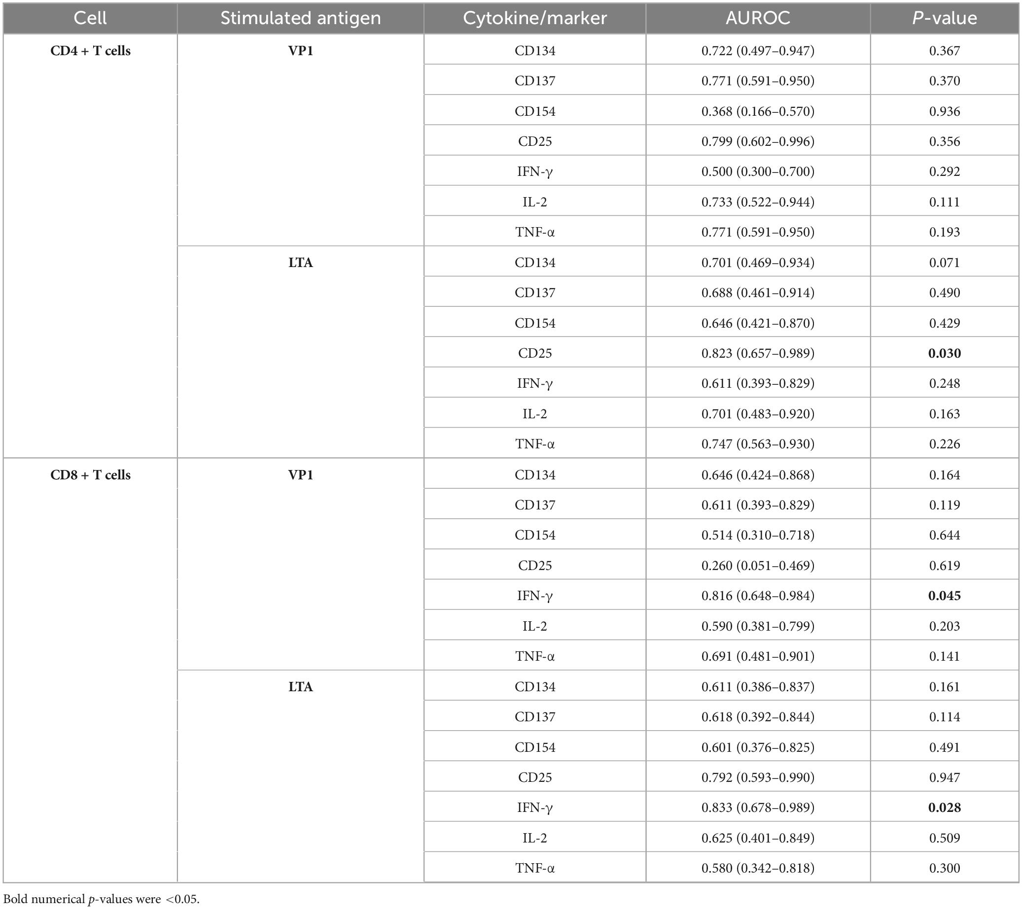 Results: VP1- or LTA-stimulated CD4+ and CD8+ T cells showed optimal discriminatory power between BK and nBK groups when co-stimulated with CD28/CD49d. VP1-stimulated CD4+ cells differed significantly between groups in IL-2, TNF-α, CD25, and CD137, while CD8+ cells differed significantly in IFN-γ and CD25. LTA-stimulated CD4+ cells showed significant differences in TNF-α and CD25, and CD8+ cells differed significantly in IFN-γ and CD25. LTA-stimulated CD4+CD25+ and CD8+IFN-γ+ cells provided significant AUROC values (0.823, 95%CI 0.657–0.989, p = 0.030; and 0.833, 95%CI 0.678–0.989, p = 0.028, respectively) at a cutoff of > 0.2% positive cells.