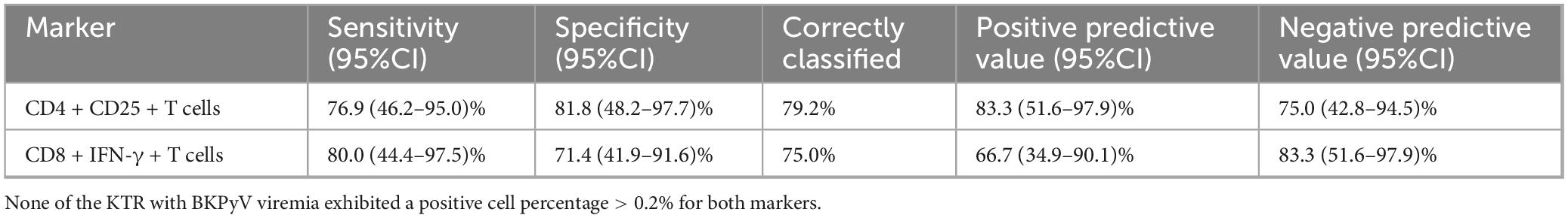 Conclusion: LTA-stimulated CD4+CD25+ and CD8+IFN-γ+ T cells differentiated KTR with and without low-level BKPyV viremia, representing promising markers for early clinical diagnostics and future studies.