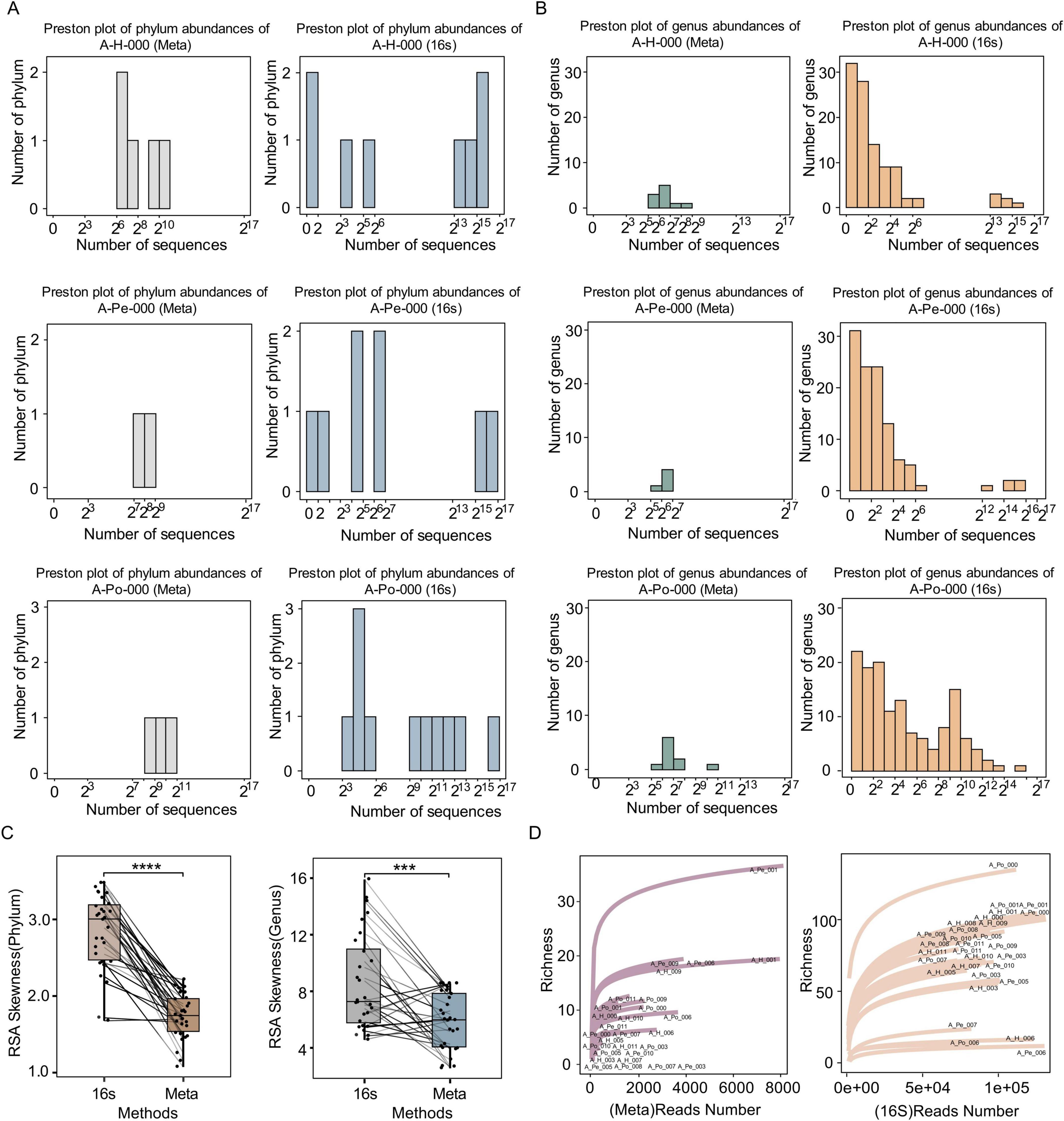 Figure 1. Comparison of microbial community distributions and diversity metrics between 16S rRNA sequencing and shotgun metagenomic sequencing. (A) Preston plots showing phylum-level abundance distributions for one representative patient (A-H-000, A-Pe-000, A-Po-000), based on shotgun metagenomic sequencing and 16S rRNA sequencing. (B) Preston plots of genus-level abundance distributions for the same samples, derived from shotgun metagenomics and 16S rRNA sequencing. Preston plots are shown on a log2 scale for sequence counts. (C) Boxplots of RSA skewness values at the phylum and genus levels, comparing 16S and shotgun sequencing methods. (D) Rarefaction curves depicting richness estimates for each sample, sequenced by shotgun metagenomics and 16S rRNA. Sample IDs are labeled. Significance levels: ***P < 0.001, ****P < 0.0001. 16S, 16S rRNA Sequencing; Meta, Shotgun metagenomic sequencing.