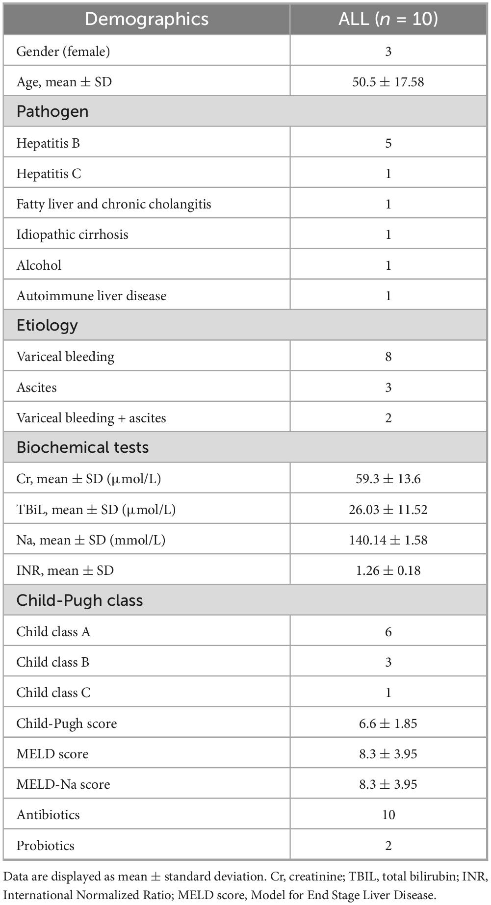Disease severity was assessed using the Child-Pugh classification: 6 patients were class A, 3 were class B, and 1 was class C (mean score = 6.6 ± 1.9). The mean MELD score and MELD-Na score were both 8.3 ± 3.9. The mean serum creatinine, total bilirubin, sodium, and INR levels were 59.3 ± 13.6 μmol/L, 260.3 ± 11.5 μmol/L, 140.1 ± 1.6 mmol/L, and 1.26 ± 0.18, respectively. All patients had received antibiotics prior to the procedure, and 2 had concomitant probiotic use.